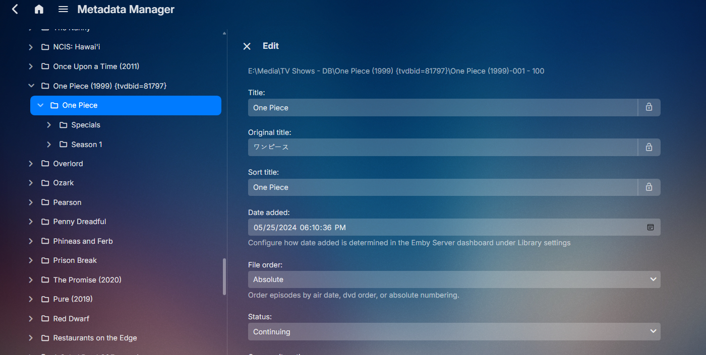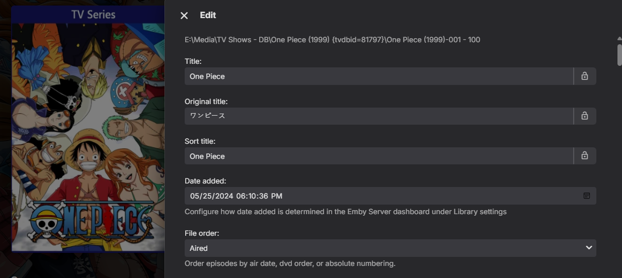 RokeWayne 5 Posted May 27, 2024 Author Posted May 27, 2024 Hi, together. @LukeFirst I'll show you how my gui in emby looks on different places. The sequence that @Happy2Playsuggested I'll do after work today. For your convenience I set the display language to english, so we can discuss without the need to translate anything that appears. My Library folder (SMB-share, top directory / folder): results in emby (top level folder view ) You can see that other shows are already correctly identified and also, that additional information after a hyphen will not appear on the emby side WHEN the tv show (or season) is corectly found / identified. in the special case of one Piece you can see no year below the entry, a small "folder" icon in the corner of the tile (upper left) and the entry is clearly named like the folder in my share. Now we'll go into the one piece folder on my share and klick on that one piece entry in emby: in the share you now see: and in emby: From my point of view the subfolders are now merged into one show by emby. Since my Experiment 2 worked (where i removed the layer that contains the separate folders) the folder above seems to be just - well - a directory. Maybe I could've called it anything, but for the purpose of oversight in my library folder i called it like what resides in it, so "One Piece". metadata on the tv show level: Since I let folders revert to my old state overnight, my file order configuration was back at "airdate". I changed it to "absolute" and this again happened after some minutes: Again it looks like the metadata addition halted on the verge of my folders. See above to confirm, that around 400 files are in the folders. If its again that state like when i started the thread, i can wait however long i want and no other episodes will get their metadata. Now my configurations, that could be involved, in emby and to the library: Now i think subtitle and playback config doesnt matter. If I did miss a crucial config, just tell me. Later /After work I'll try to add the files how @Happy2Playtold me. I'll give another update then. Thx.