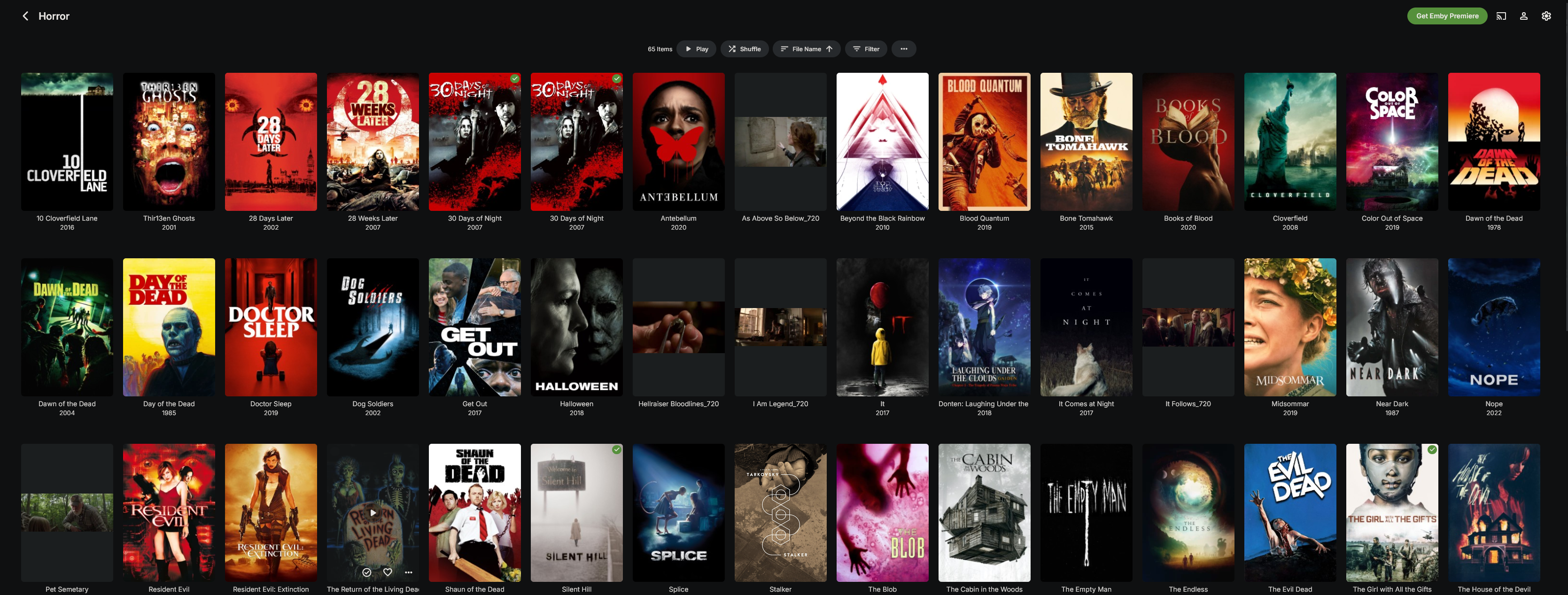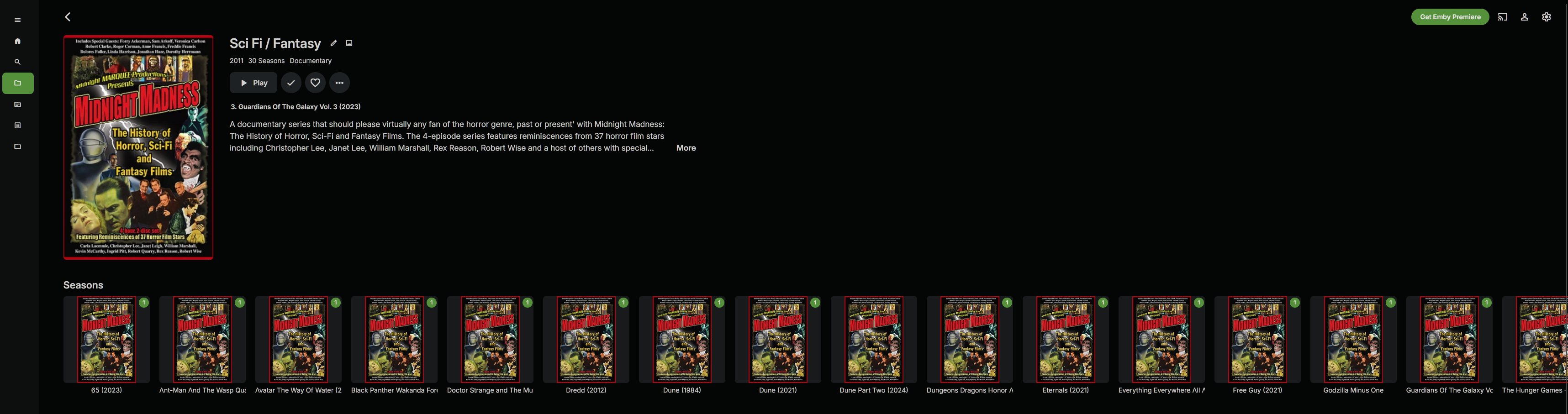 ImagoX 1 Posted May 28, 2024 Author Posted May 28, 2024 (edited) 16 minutes ago, Luke said: HI, I don't quite understand. What are you expecting to see? How did you configure the library in Emby library setup? What folder paths are added to it? Attached are two screenshots: this is what my 'Horror' folder looks like - every title in that folder is read by the Library as a distinct title, and shows a movie poster for each item. THis is how ALL my other genre folders look: The second image is what my 'SciFi / Fantasy' folder looks like - for some reason almost all the titles in that Folder have been placed in a 'Season One' sub-folder (like a TV show) with a scattered few in other sub-folders. PS - I have NO IDEA what the 'Midnight Madness' thing is - I don't own that title or have it on my Media Server (a metadata scan somehow picked that erroneously up): I just told Emby to scan the entire HDD to add all the titles to the Library. Until recently SciFi / Fantasy looked just like Horror, but changed for some reason. The goal is to have SciFi / Fantasy diaplay just like Horror. Edited May 28, 2024 by ImagoX