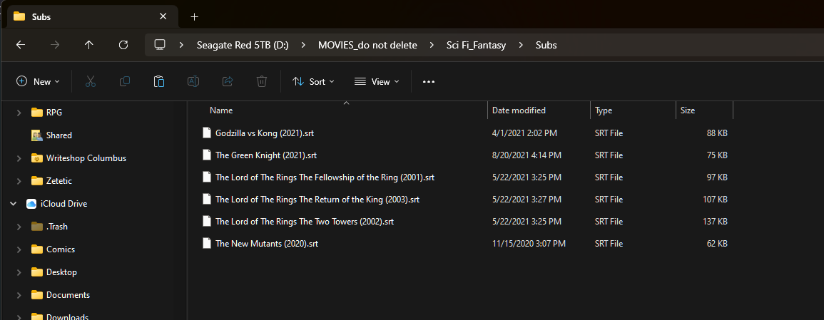 ImagoX 1 Posted June 2, 2024 Author Posted June 2, 2024 23 hours ago, Happy2Play said: @ImagoXA question if you select edit metadata on this what path is shown? But can only guess maybe the movies that are numbers, can you test moving them out of that library? (65, 300, 2010) Also can you remove the "Subs" folder as that could break things? What is the folder for? But may need to see the rest of the content in that folder. Ideally all movies should have there own folders to contain all of their content but really depends on where you save images/metadata/subtitles. May also need to see how your are saving subs in the movie folders. A screenshot of the 'Subs' folder is below - it's where I *used* to put my .SRT files for some movies. I can delete it, sure. I've also attached an example of one of the *new* folders I'm using for MP4s that also have an .SRT - they all only have the movie and the subtitle file and nothing else. Note, however, that my 'Drama' and 'Comedy' and other genre folders *also* use the same structure and are displaying properly (??).