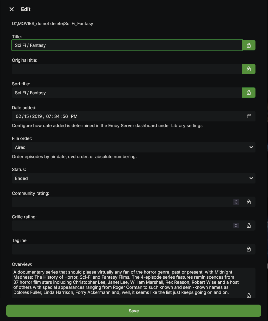 ImagoX 1 Posted June 4, 2024 Author Posted June 4, 2024 On 6/2/2024 at 9:52 PM, Luke said: Hi, the presence of the lock icons being green suggests that you did. Is it possible that you did this and forgot about it? Additionally, can you please list out all of the libraries that are added in Emby library setup, as well as the folder paths that are added to each one? Thanks. I might have locked that entity after it populated the fields - at one point I 'Removed all Metadata' from the SciFi_Fantasy item hoping it would pick it back up again correctly, but... no. When I set up my Emby I pointed it to the sub-folders in the screenshot below and it auto-scanned and populated all the metadata. It's correct for all the other genre sub-folders *except* SciFi_Fantasy - it was correct for many months, then for some reason it changed and thought it was a TV Show.