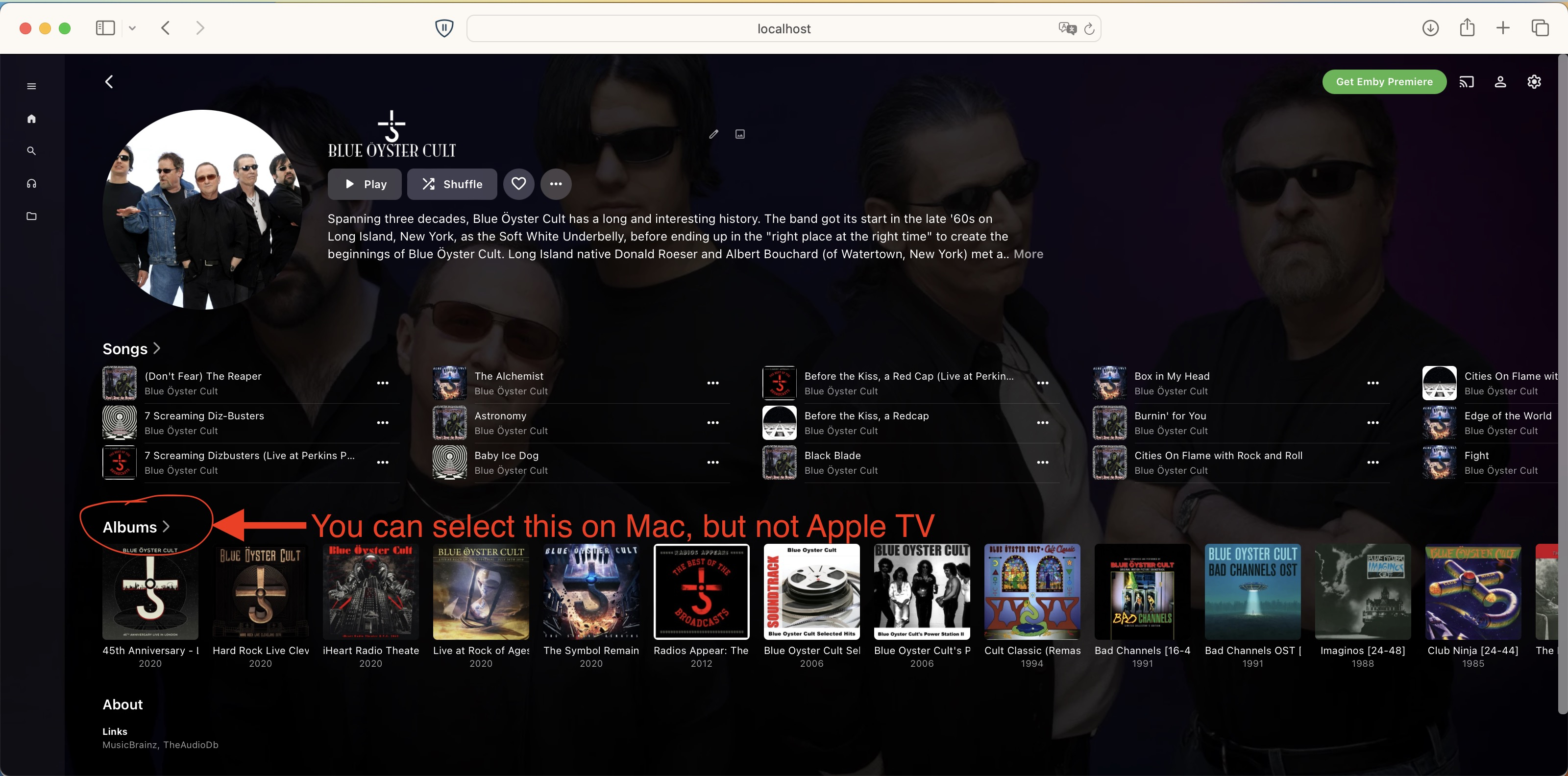 SamES 1056 Posted August 20, 2024 Posted August 20, 2024 24 minutes ago, Growl said: layout is the same (mostly) between Mac OS and ATV, but in Apple TV you can’t click on the Albums text (just above the single row of albums and their art) in the Album Artist (highlighted in the Mac screenshot below) which opens up to a new page and shows several rows of albums and their artwork, Yes, this is a limitation in ATV in that we can’t make the section headers a clickable component to launch another view and don’t currently have a good work around.