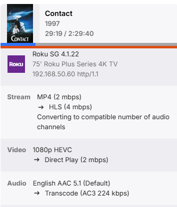 Lessaj 467 Posted June 3, 2024 Posted June 3, 2024 That log is unfortunately not the most useful since it's only the hardware detection. That stream is only transcoding the audio which is a very lightweight operation so this shouldn't be transcoding related. I'm not familiar with Roku if there's any settings related to playback, if it advertises support for HEVC it should be able to handle a 2 Mbps stream... 1