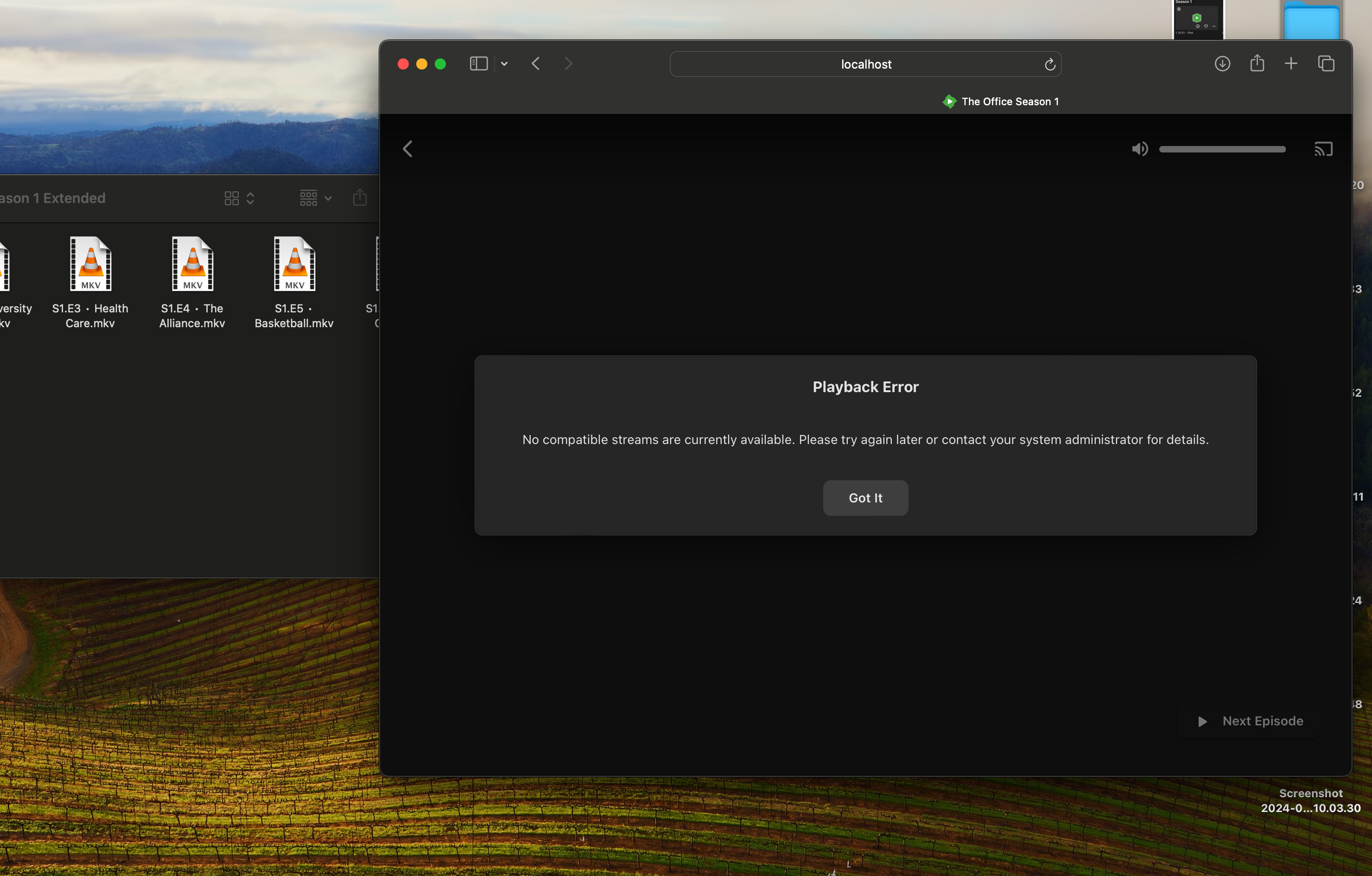 IncredibleJohn 2 Posted June 8, 2024 Posted June 8, 2024 (edited) My problem is that I can't do playback on my Mac on my emby server. At first I thought it was because the files were mp4, but when I installed and properly got them working by default with vlc, this still didn't help in emby. What happens is I click on an episode, this error comes and it instantly finishes the episode and marks is as watched. I can playback on my Apple TV with these files from my server, but the issue there is regardless of when I leave the episode, if its in the middle of it or whatever it marks it as played which is a big issue. I then decided to convert all the files to MKV to see if that helped, removed and re-added a new library with the new files, but still an issue. My aim is to have them working fine on Mac, but if not, at least working to where they're not immediately marked as played on my Apple TV. Hopefully someone can help with this, I did create a standard new library and didn't have issues when doing the exact same thing on PC. Also using the latest emby server for the latest OS of Mac. I also wanted to note in the logs it doesn’t show up any errors, it just says “my username played this media file” and that’s it Edited June 8, 2024 by IncredibleJohn I wanted to add more information
