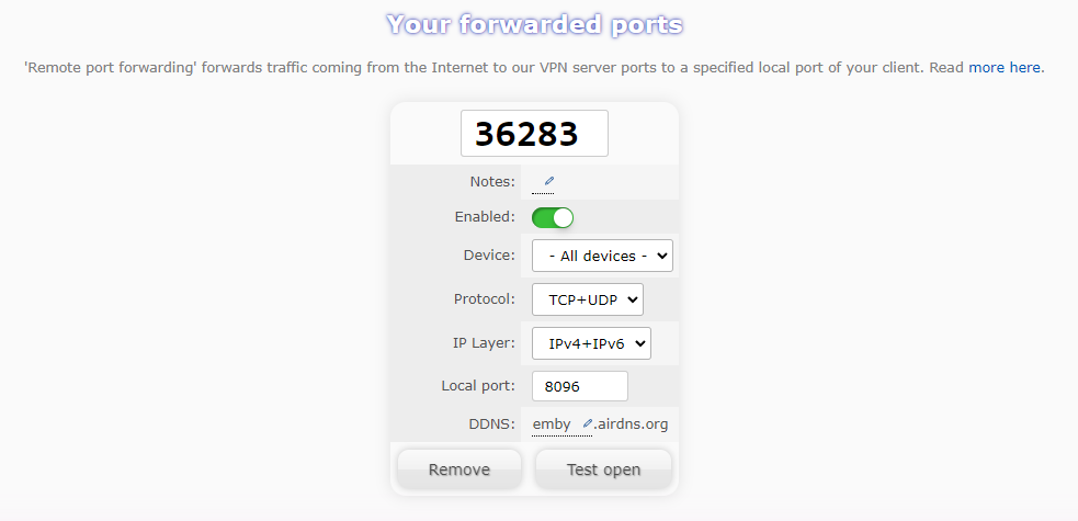 I have also tried to forward the port assigned (36283) to the local port (8096) in my router but it tells me port 36283 is already assigned, and while it is not in my list of forwarded ports I can only assume something to do with the VPN has automatically done it for me, buuuut could be wrong. I would imagine it is forwarded properly otherwise I don't think I would be able to connect to the server at all.