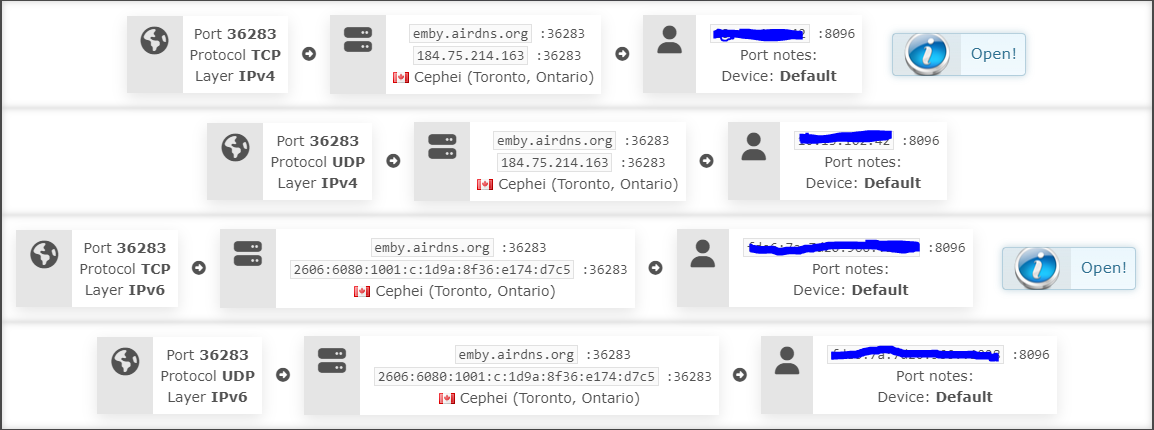 I have recently switched to Emby to use the Live TV functionality and have gotten a reliable provider for TV. I was previously using Mullvad VPN but couldn't get a remote connection to Emby to work even through Mullvad split tunneling. So I have switched to AirVPN to take advantage of the ability to forward ports. I have set up AirVPN and set up the forwarded port as shown in the image, I have been assigned port 36283 and forwarded it to port 8096 and assigned DDNS address of emby.airdns.org and I have confirmed it is open as shown in the image below. I have set up my emby settings accordingly as shown in the images. Before, when I was using Mullvad, I couldn't even get a remote device to connect to the server. Now, with this setup, I have at least managed to gain connection to the server. However, now I cannot watch any of the channels, on a remote or local device. I get error 456 as shown in the image below.