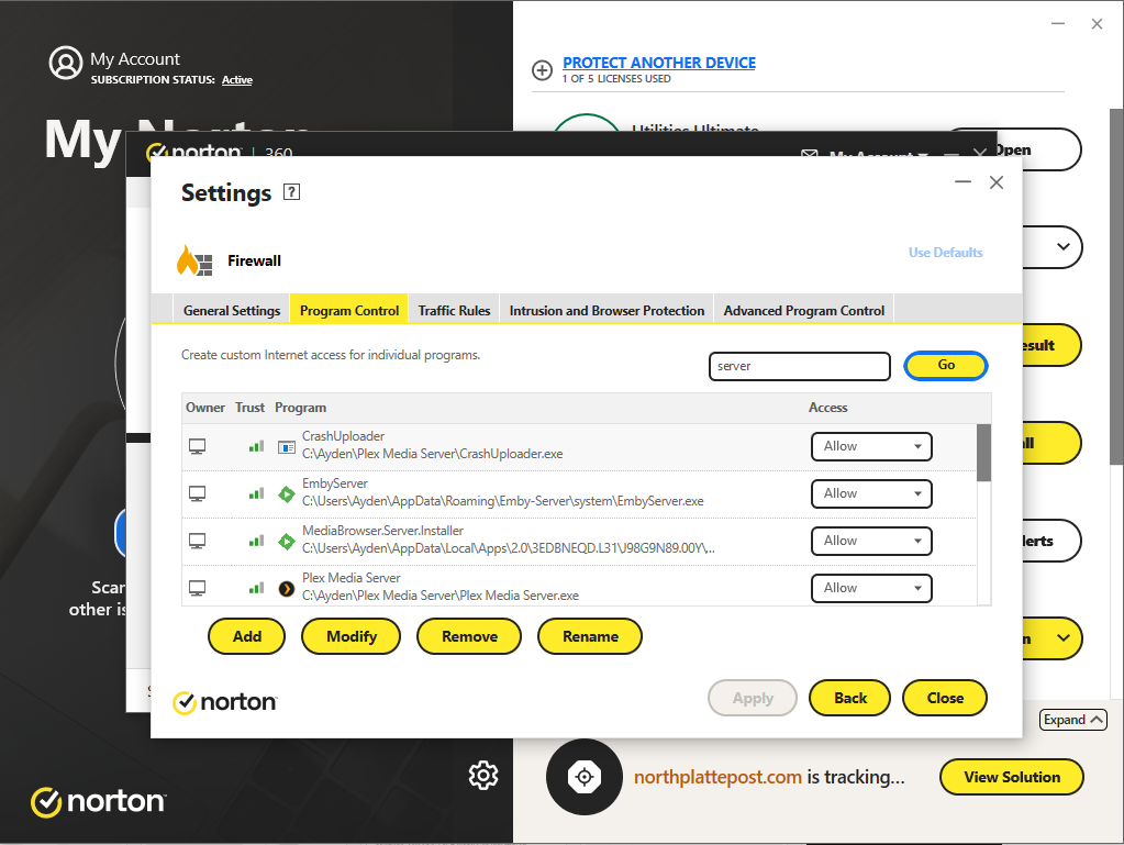 I have done a little googling on the topic and found some people that try to blame the issue on the firewall. I have strictly disabled all Windows Defender features entirely, as well as all firewall functionality on my router. All firewall/security related activity takes place on my Norton antivirus/firewall. As shown in the attached picture, I have also confirmed that Norton is allowing all traffic for Emby Server and I am unsure if there are any other settings that may be causing this error.