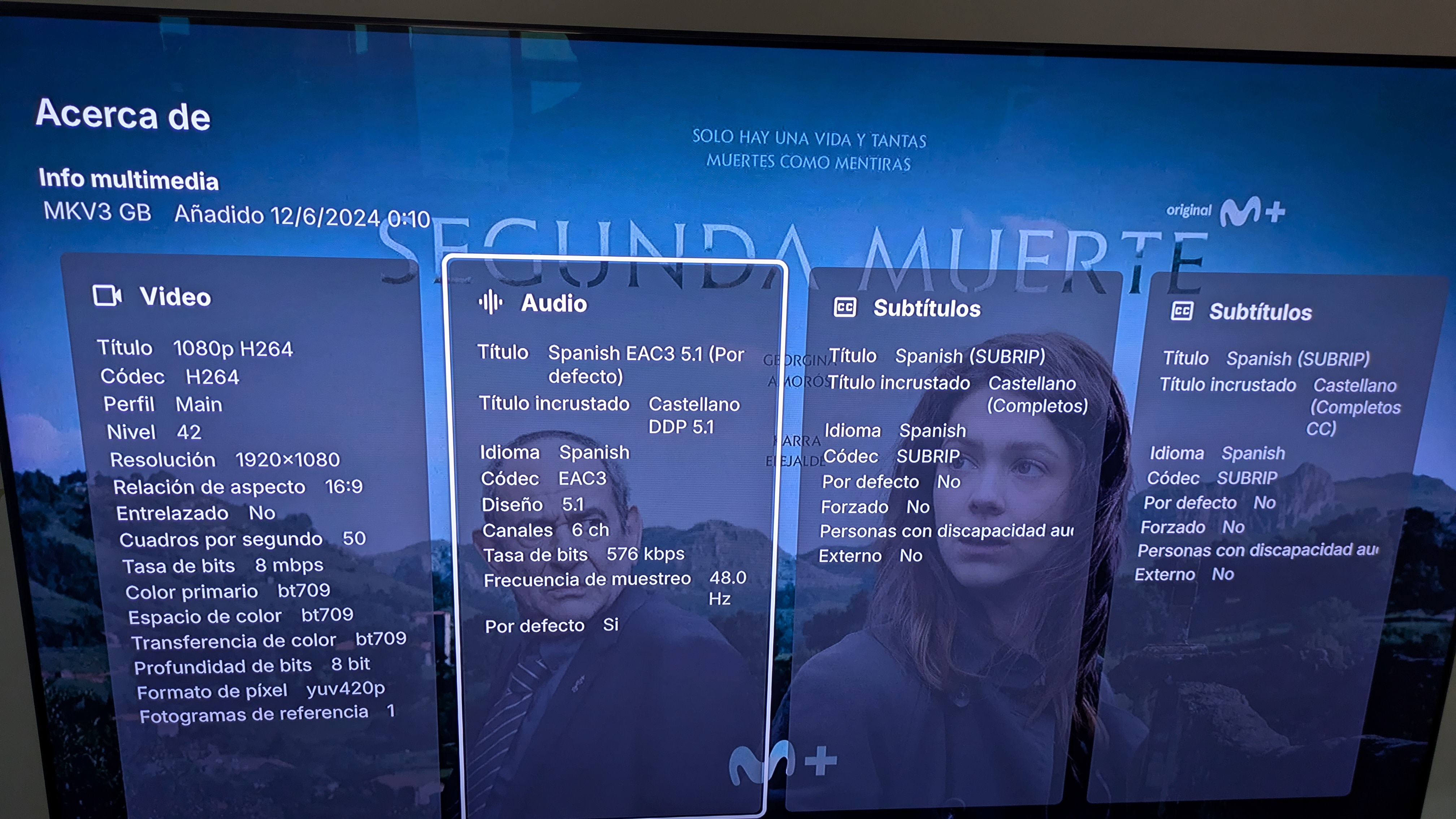 Xete2 0 Posted June 14, 2024 Author Posted June 14, 2024 Las películas o series que tienen audio (EAC3 5.1) y no se puedo cambiar, porque no tiene otra opción de audio, no se escucha el sonido. Solo tengo problema con el formato EAC3 5.1 Los pasos que he seguido han sido: Actualizar a la última versión (foto1) La configuración que tengo puesta (foto2) La pista de audio con la que tengo problemas (foto3)