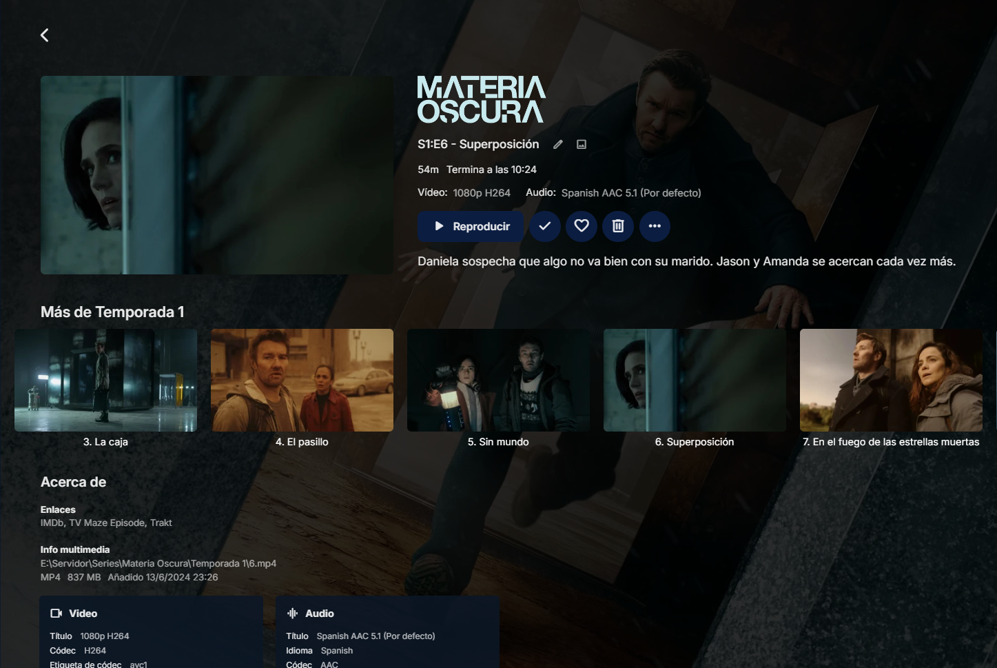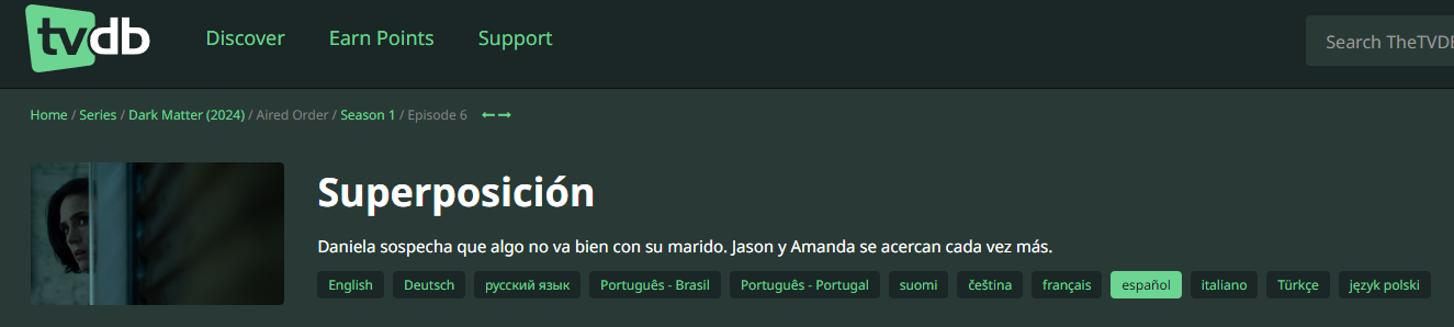 rbjtech 5284 Posted June 19, 2024 Posted June 19, 2024 (edited) Does metadata exist in the language you have chosen ? Chapter info will be from the file, this has never been provided by the metadata providers, although I think you probably mean this episode ? Thetvdb have it in Spanish ? Dark Matter (2024) - Superposition - TheTVDB.com Edited June 19, 2024 by rbjtech