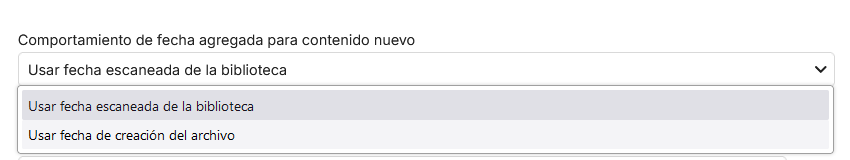 Muzzy 1 Posted June 22, 2024 Author Posted June 22, 2024 19 hours ago, Mibok said: Perdón la opción a la que me refería era para las imágenes de los medios como posters y miniaturas. Al parecer los metadatos (el archivo nfo) siempre se guardan junto a la película. Desconozco porque cada vez que cambias la película de disco duro la reconoce como una película nueva. Quizás algún administrador nos pueda aclarar si en el archivo nfo se incluye la fecha de adición y si el servidor se basa en eso para considerar algún contenido como nuevo. Si, lo acabo de ver, esa opción la tengo desactivada, la de imagenes, etc. Pero creo que la opción que tiene que ver con lo que me pasa es la siguiente que adjunto. Ahora mismo tengo activado: "Usar fecha escaneada de la biblioteca" Si tenía la otra opción activada, me di cuenta de que, por ejemplo, si tengo una película descargada de hoy, con esta fecha y no la meto en Emby hasta dentro de 10 días, pero en esos 10 días voy metiendo mas películas, cuando meta esta película de hoy pero dentro de 10 días, no me aparecerá en "Lo ultimo en películas" ya que al llevar la fecha de hoy, me la deja "atras" y no la veré en novedades, no se si me explico. Por eso cambié la opción hace unos meses. Creo que voy hacer unas pruebas a ver si estoy en lo correcto.