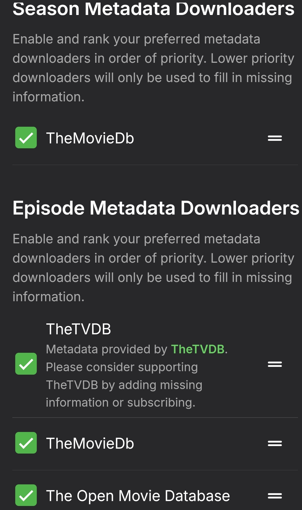 darkassassin07 652 Posted June 23, 2024 Posted June 23, 2024 Under your tv library settings; what order is your metadata fetchers in? This works for me, using the same folder layout (/Mythbusters/Season <year>/Mythbusters - S<year>E01 - <episodename>.mkv)
