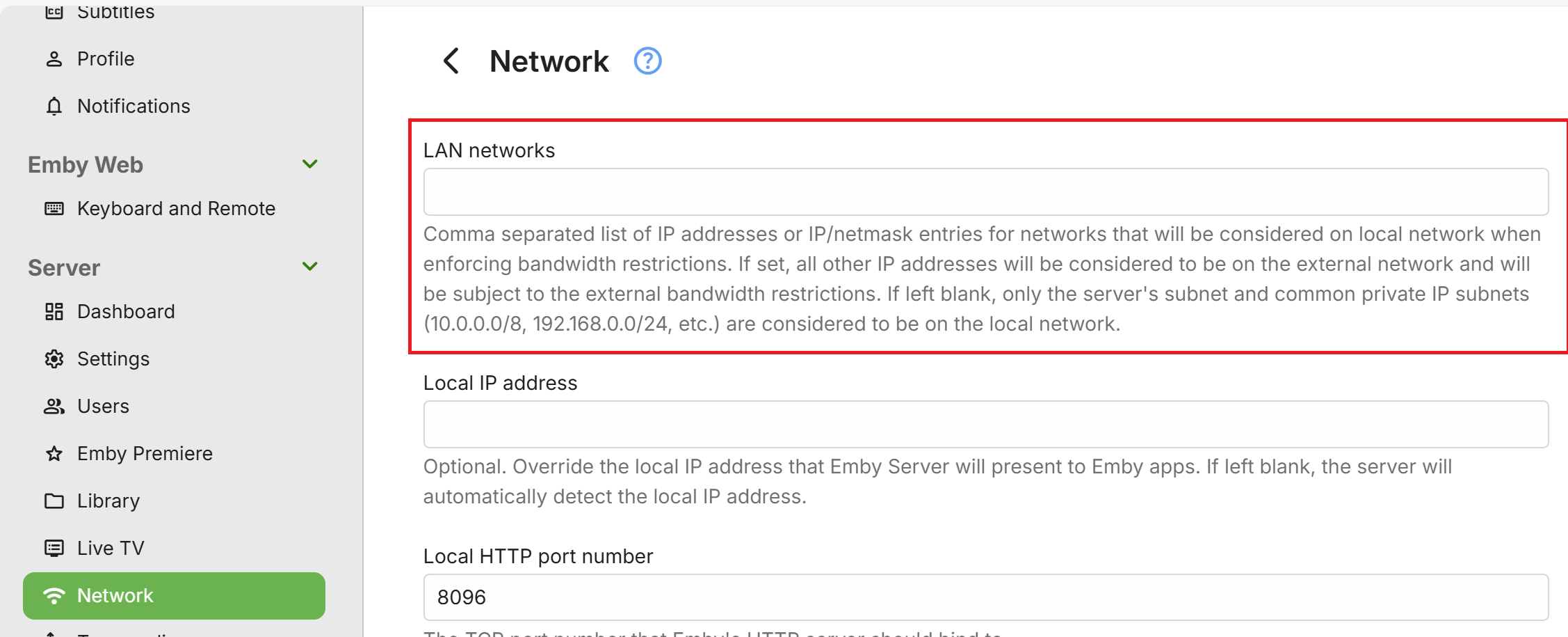 sa2000 674 Posted July 10, 2024 Posted July 10, 2024 (edited) 19 hours ago, Q-Droid said: I suspect this would've worked if the OP had added the local VPN (wireguard) subnet to the LAN subnet in the Emby network settings? Nothing else needed unless this was tried and I missed i Thanks. Yes that would be an easier option. I don't think it was tried and @cptbrainiafound that enabling Remote Connections made it work. I see that we just mention Bandwidth Restrictions for this "LAN networks" setting. That would need tweaking. @cptbrainiaCould you try this as alternative to having Remote Connections enabled - especially since you indicated you did not want remote access. So find the IP address subnet used by the VPN locally and add that subnet to the LAN networks server setting. This is the screen in Server Settings Edited July 10, 2024 by sa2000