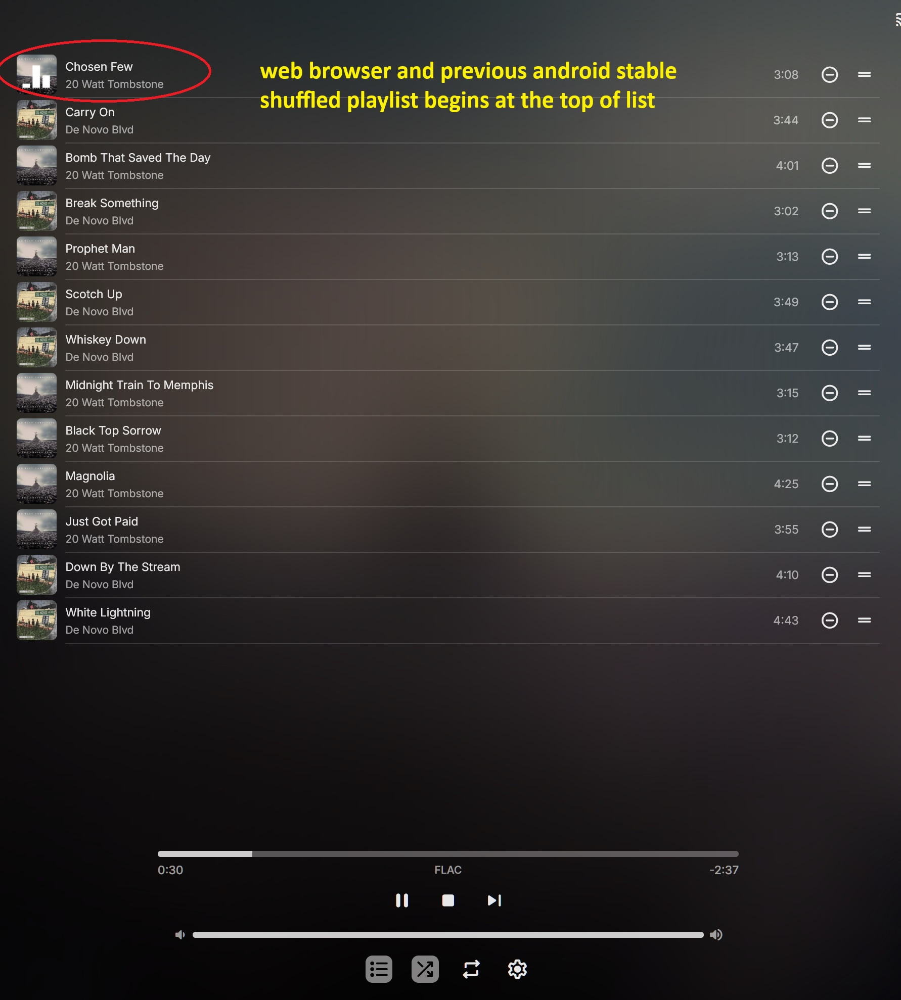 viking19 32 Posted July 7, 2024 Author Posted July 7, 2024 That's not how it works though. I made a simple two album playlist example and clicked shuffle but single albums works the same. On the web browser and the previous android sable clicking shuffle creates a shuffled now playing list and begins playing at the top of that list. It will play sequentially through the list until the bottom. This is the way it has always been. On android 3.4.11 playback will start in a random spot within the shuffled now playing list and then play sequentially from there to the bottom. This can't possibly be correct behaviour. 1