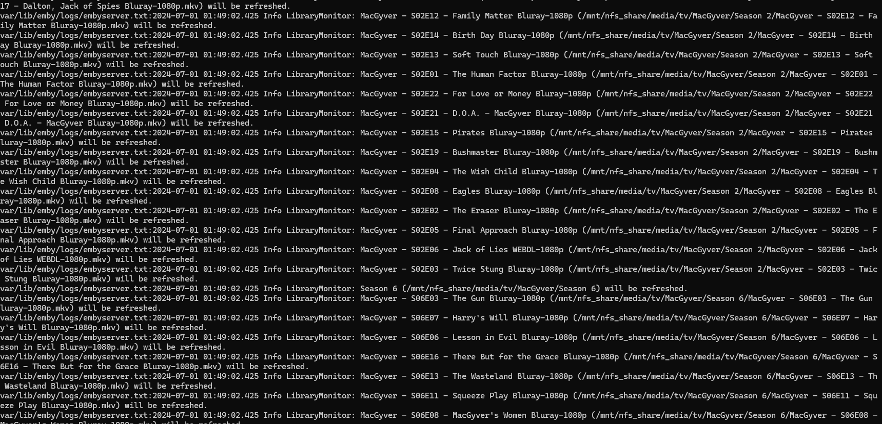 Happy2Play 9780 Posted July 1, 2024 Posted July 1, 2024 Please post the full server log as that snipped only shows RTM sees the file change and will be refreshed. It does not show any file actually being probed for media info or getting metadata.