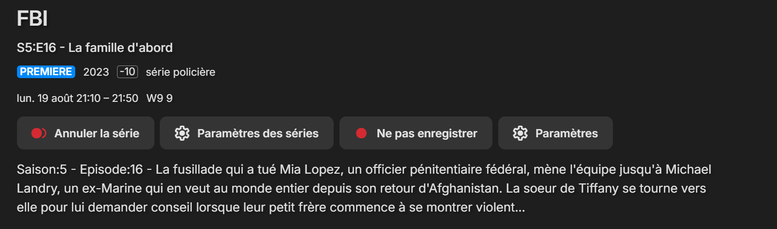 pdeliot 10 Posted August 19, 2024 Author Posted August 19, 2024 (edited) This was functional in the past... I believe it stopped working starting 4.8. Maybe a change in the way episodes were identified. In the recording planning section, the episode numbers seems properly identified. Here an example with "FBI" because HPI has no more broadcast at the moment. Edited August 19, 2024 by pdeliot
