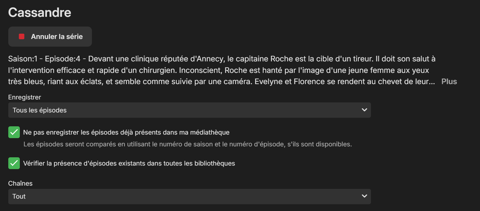 pdeliot 10 Posted February 23, 2025 Author Posted February 23, 2025 (edited) Hi, I've installed the beta and the result give me a mixed felling. It seems working for some series, but not for others. For example, a series called CASSANDRE... still recorded old episodes existing in the library. Same name, same external ids.. Once recoder, Emby was able to find properly the "watched" status. For example, after recodring, in "Recordings" library: We can seed the just recorded episode marked as read.. and it is true, see from the over library were it exists. You will find an XMLTV containing next planned broadcast for CASSANDRE. Anothert exemple: "Meurtres en eaux troubles" If I can provide more details to help solving this behavior, feel free to ask... telerama (3).zip Edited February 23, 2025 by pdeliot