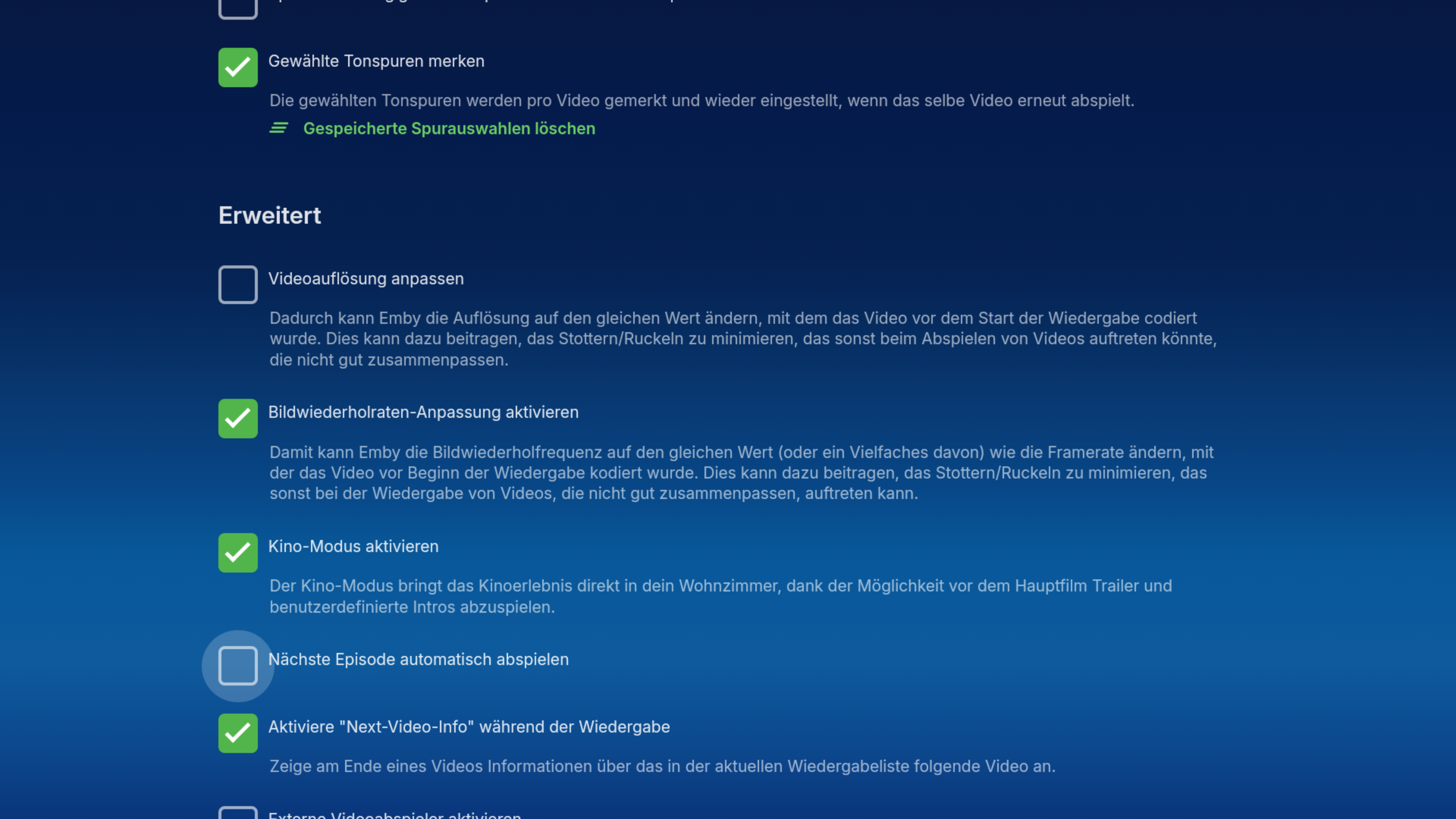 Teddyknuddel 136 Posted July 21, 2024 Author Posted July 21, 2024 6 hours ago, TMCsw said: This Has bugged me too as it does NOT make sense to me, but the only way I've found to stop this is by turning off the option bellow it too: I don't like this (and don’t understand the logic (or lack there of))! But waiting a little longer for the next episode to show up and hitting play is better (at least for me). Habe ich inzwischen auch festgestellt: Man muss "Aktiviere Next Video Info" deaktivieren. Dann kommt nur der Button "nächste Episode" aber startet nicht. Kann man als "Notlösung" durchgehen lassen. Korrekterweise würde man aber beim vorherigen Punkt wieder landen. Mal schauen, was passiert, wenn man nur "nächste Episode automatisch abspielen" aktiviert, und "Next Video Info während Wiedergabe" deaktiviert. Vielleicht hüpfen dann kleine Marshmellow-Männchen aus dem TV Sicher, ist ne Funktion, die man lieber anlässt. Aber so oft, wie meine Lady alleine vor dem TV einschläft..... wird nix abgespielt, schaltet sich bei mir irgendwann alles von alleine aus. Und somit kann man dann auch Energie sparen. Tut mal was für das Grün in Eurem Logo.