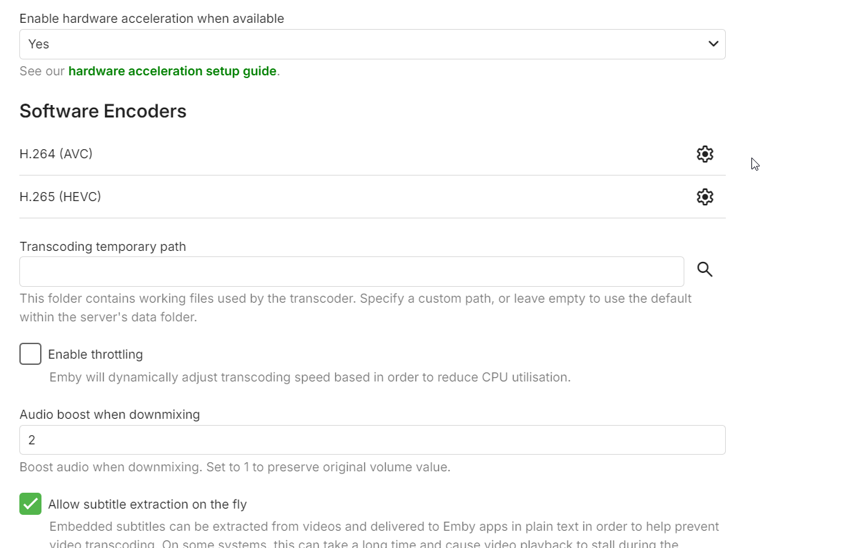 bobdobbs 2 Posted July 20, 2024 Author Posted July 20, 2024 2 minutes ago, Happy2Play said: No idea what you have done here as transcoding does not happen in any assign library paths unless you have misconfigured your setup. How are your libraries setup? Did you modify the transcoding path? Thank you for the response. So my synology server has 2 folders (Movies, TV Shows) I installed Emby and pointed it to those folders. All has worked fine since install except for some random movie plays etc or TV show plays etc, which resule in the above (I added more information to my original post). As for the the transcoding path, i can only find one reference to that which is the temporary transcoding path and that is empty (see attached)