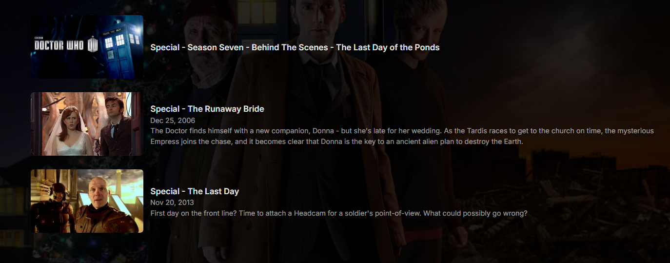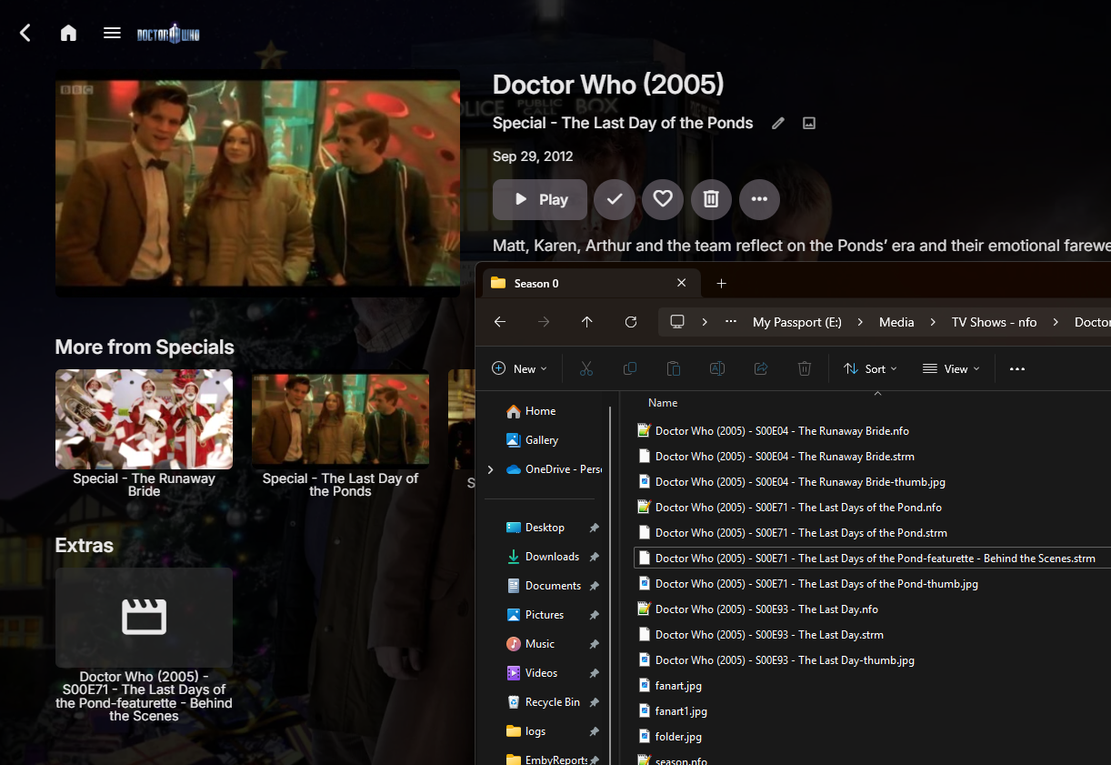 Bigmack3000 107 Posted July 25, 2024 Author Posted July 25, 2024 3 hours ago, sa2000 said: I see from the log that you have these featurettes media files The TV Naming article indicates that it should be possible to have these extras folders at the season level. Could you try putting these under the relevant Doctor Who (2005) season folders ? As for this, I'm really not a fan of how Emby has gone about implementing tv extras in general. throwing them into the same pull-down tab as the episode is ugly and non-intuitive. It either hides extras away, or makes them an obstacle to get around. If emby wants to go down that road, then they should have a 2nd pull down on the episode's page where the extras are displayed. But I'd rather not split all my extras apart right now, as I am severly hoping Emby adjusts this, or makes putting them season folders optional. There are extras that don't belong to a single season in particular. Where do they go?