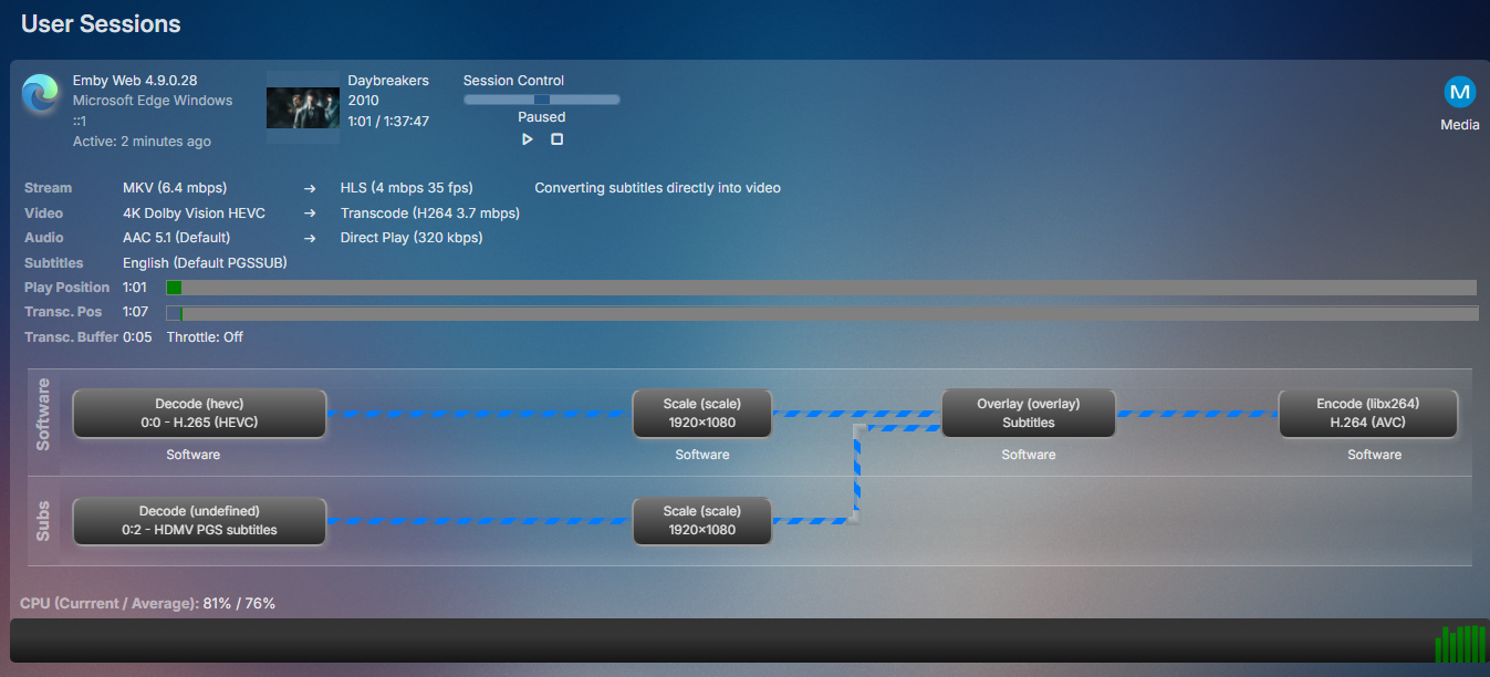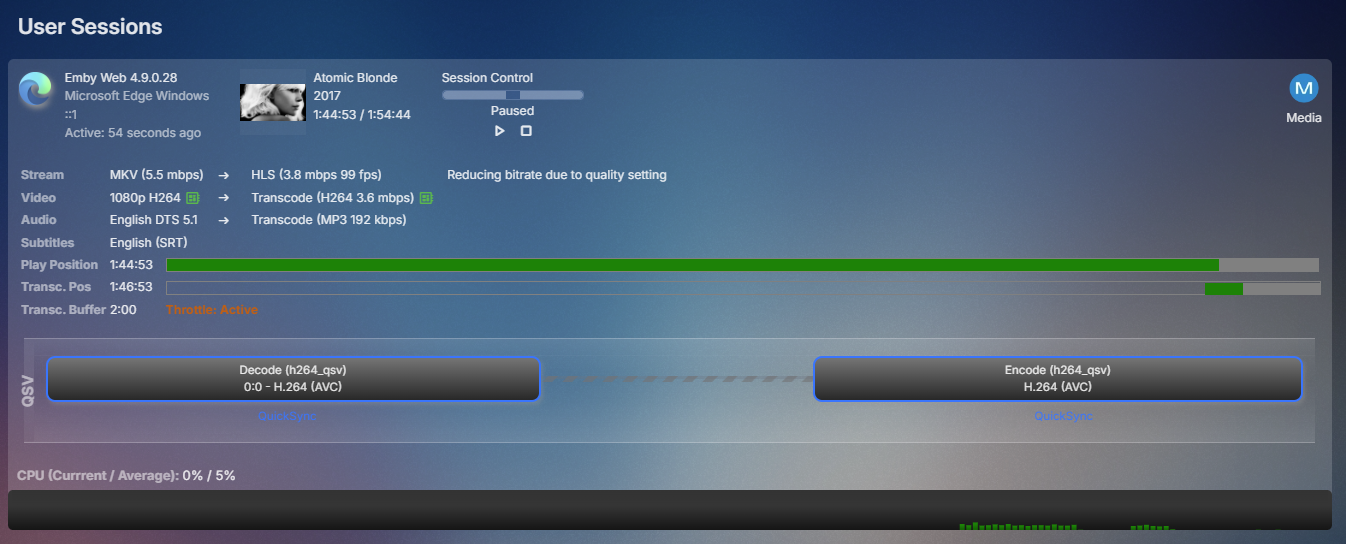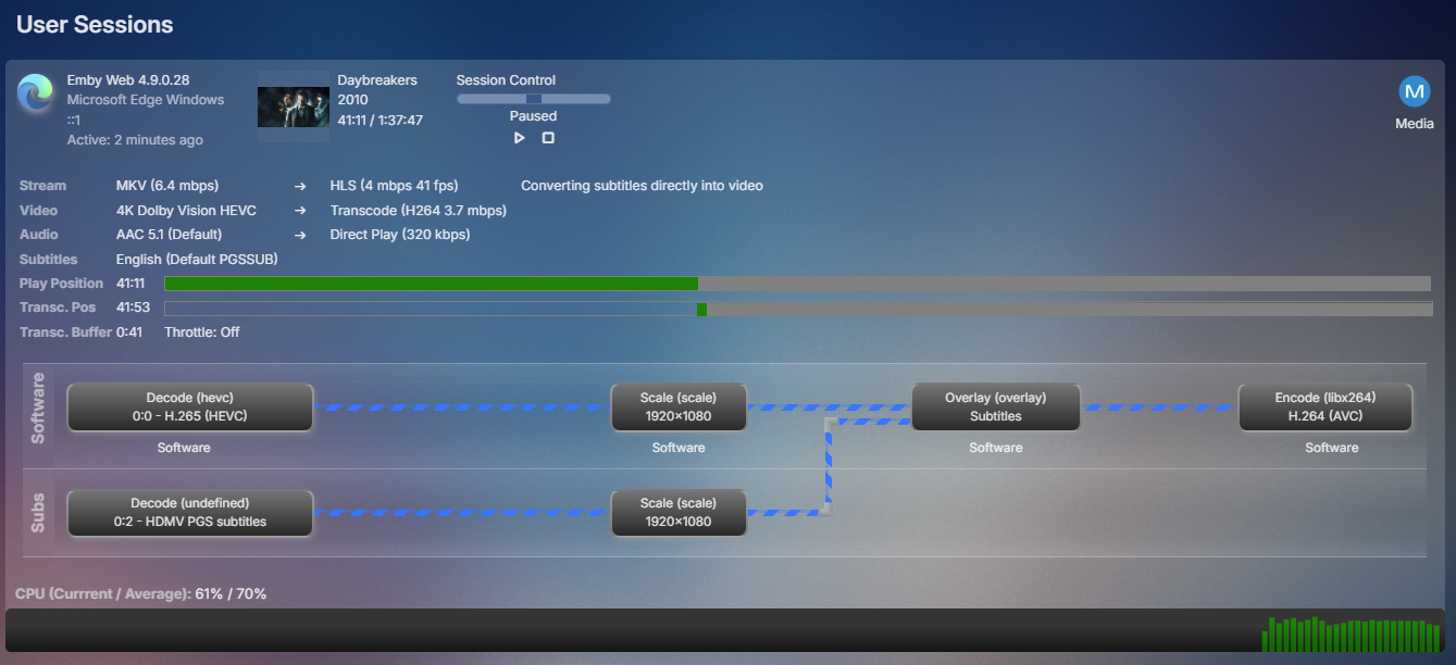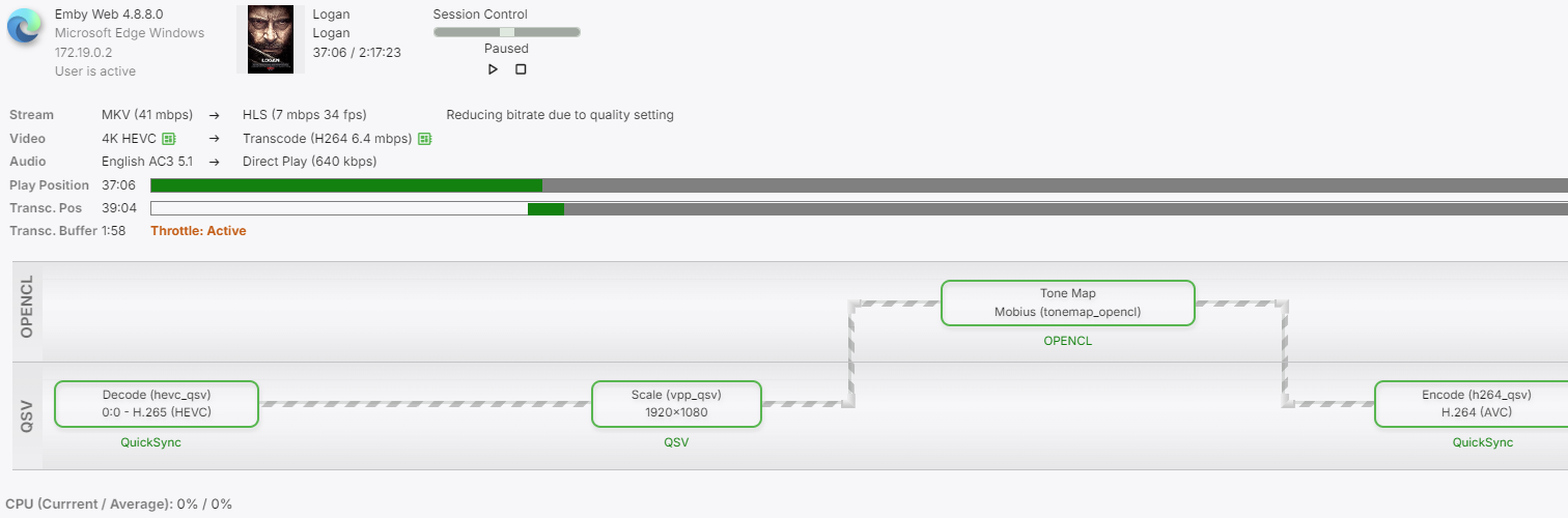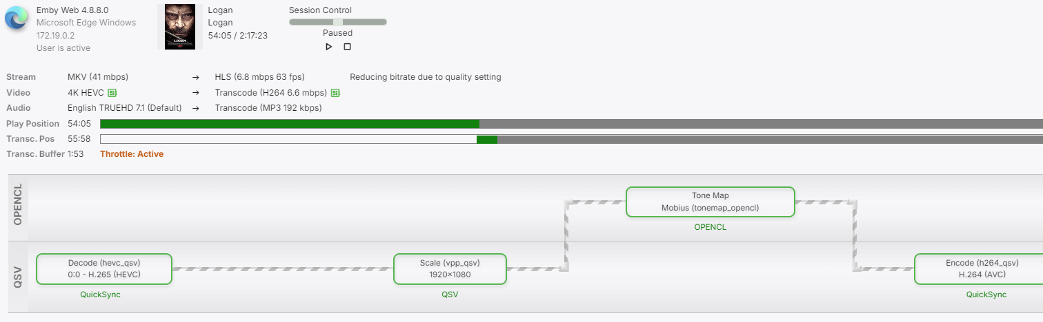 Q-Droid 989 Posted July 27, 2024 Posted July 27, 2024 I can pause at any place in a 2+ hr movie and the session drops after being paused for ~60 seconds. Chromium browsers (Edge, Brave). I haven't tried on an app yet. But if this is normal behavior I don't see a problem with it because hitting the play button just continues without any hiccups. Don't have to wait for loading or anything, it just plays. Quote >> ThrottleByStreamBufferSize: PlaybackPosition: 01:00:13 - TranscodingPosition: 01:02:10 - ThrottleBuffer: 117s (Treshold: 115s) 15:26:31.943 elapsed=00:03:00.17 frame= 5208 fps= 29 q=18.0 size=N/A time=00:03:37.08 bitrate=N/A throttle=100 speed= 1.2x 15:26:32.444 elapsed=00:03:00.67 frame= 5208 fps= 29 q=18.0 size=N/A time=00:03:37.08 bitrate=N/A throttle=100 speed= 1.2x 15:26:32.945 elapsed=00:03:01.18 frame= 5208 fps= 29 q=18.0 size=N/A time=00:03:37.08 bitrate=N/A throttle=100 speed= 1.2x 15:26:33.446 elapsed=00:03:01.68 frame= 5208 fps= 29 q=18.0 size=N/A time=00:03:37.08 bitrate=N/A throttle=100 speed=1.19x >> ThrottleByStreamBufferSize: PlaybackPosition: 01:00:13 - TranscodingPosition: 01:02:10 - ThrottleBuffer: 117s (Treshold: 115s) 15:26:33.646 [q] command received. Exiting. [segment @ 0x20c48c0] Opening '/mnt2/Media-temp/TVHTS/emby/transcoding-temp/9B3713/9B3713.m3u8.tmp' for writing SegmentComplete=video:0 Index=1243 Start=3729.225400 End=3730.226400 Duration=1.001000 offset_pts=0 start_pts=3729225400 Frames=24 filename=9B3713_1243.ts elapsed=00:03:02.00 frame= 5208 fps= 29 q=18.0 Lsize=N/A time=00:03:37.15 bitrate=N/A throttle=100 speed=1.19x video:255071kB audio:5097kB subtitle:0kB other streams:0kB global headers:0kB muxing overhead: unknown EXIT 1