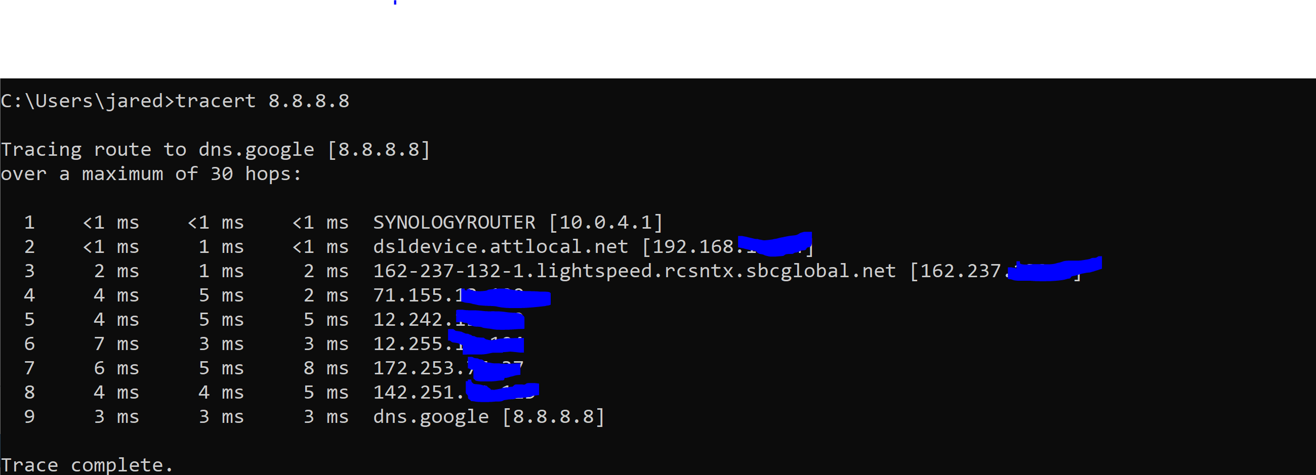 iamjarbear 8 Posted July 29, 2024 Author Posted July 29, 2024 3 hours ago, Q-Droid said: Did you forward ports on the BGW? Do you have another router connected behind the BGW? AFAIK ATT doesn't use CGNAT. Don't rely on UPnP for port mapping. It should be avoided/disabled. 7 hours ago, sa2000 said: I added a section on CGNAT here https://emby.media/support/articles/Remote-Setup.html If the public IP is in range of 100.64.0.0 - 100.127.255.255 then it would be a CGNAT address and the solution would be to pay for a static public IP address Ok so slightly an idiot here and I think we probably need to start over on troubleshooting because again, I'm an idiot and changed stuff.... I have the BGW router set up in Passthrough Mode for My Synology Router (RT2600AC). TRACERT image below