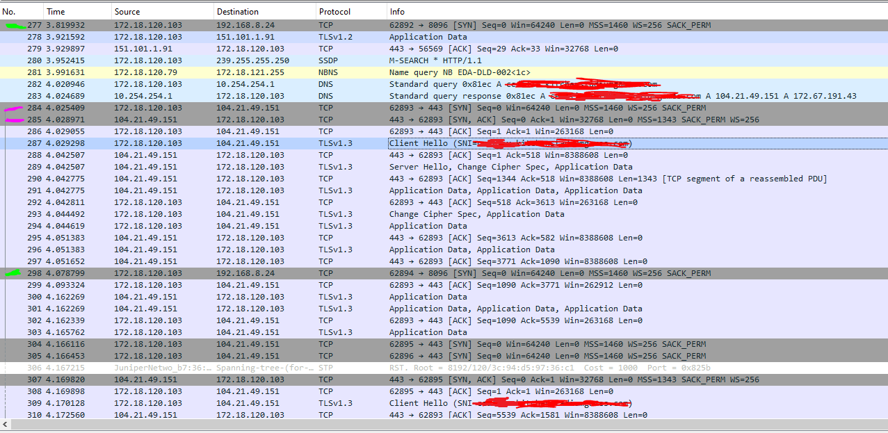 GeneralTsoSo 5 Posted July 31, 2024 Author Posted July 31, 2024 (edited) Question outside of my issue. What is the time allowed to edit a post? I was going to edit my original with additional info. But realized I need to make a new post. I come with some new, maybe not new information. I had some time this morning to test while at work, using my PC there. I have noticed a few ways that I see my internal IP address when using ET. 1. Upon opening ET, I will see my work PC as the source and home internal IP as the destination. 2. When ET is open (and we've seen packets with my local IP as destination), if I change server and click on the server that is already available. I will see work/source and localIP/destination. However, if I click change server > add server > and type the server info and login, Wireshark doesn't see those packets. Not sure why this is the case. The image ws_et_opening I have added shows two instances of opening ET back to back. There are always two grey entries first when initially opening ET, then the black lines occur when the ET home page is loading. However, no additional black lines are loaded when I open different media folders, and select content before actually playing it. And when playing media, no additional black lines occur either. This seems to only happen upon some initial connection. Additionally, when reading the packet information under Transmission Control Protocol I see that Conversation completeness was incomplete, as seen in the convo image. Would this mean that the syn packet didn't reach my server, the server didn't reply, or something else? It's the same error in the picture in my initial post. The colors for wireshark are different, apologies if this caused any confusion. In the last image, allsharknobite, the green marks(packets 277, 298) are the two local ip entries as ET is opening on my PC. The purple/pink marks(packets 284, 285) is the Cloudflare exchange. You can see the IP address in line 283 matches lines below it with Application Data and and TCP packets. From what I'm seeing, it seems that a connection is attempting to be made, but is dropped or doesn't resolve? I do not see any other local IP entries after the two initial opening packets(277, 298) unless they are the black TCP retransmission lines as seen in the first image. I guess security should be ok? I hope this information helps. Thank you, GeneralTsoSo Edited July 31, 2024 by GeneralTsoSo