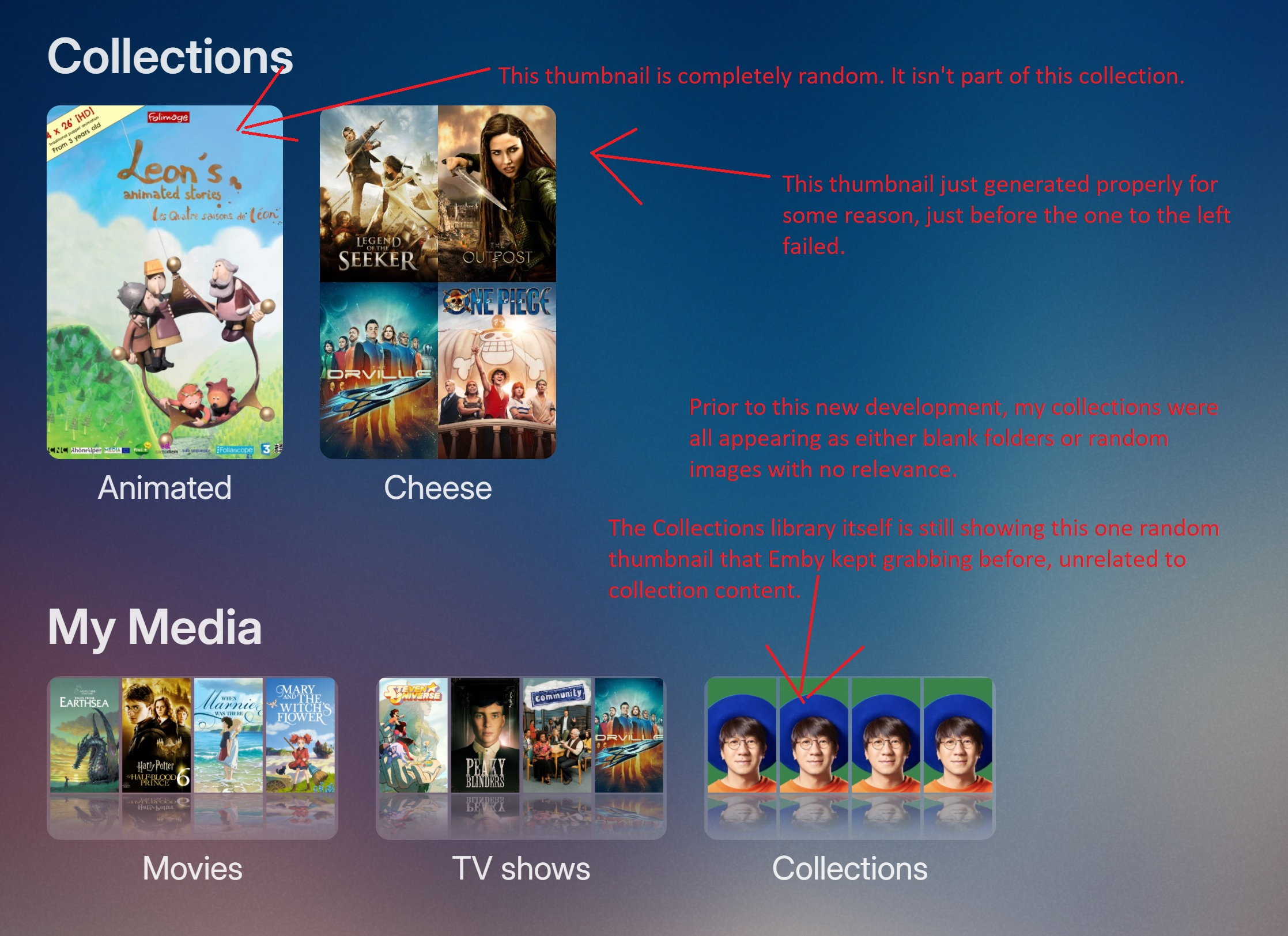 EmberAsh 1 Posted July 31, 2024 Author Posted July 31, 2024 (edited) Wow, that was an impressively unhelpful response. I don't understand what your intention was behind making it? First off, I'm dealing with this bug, not you, so the state of your library is completely irrelevant. That's how bugs work. I am experiencing--as I already stated with crystal clarity--a failure to properly generate collection thumbnails. As of when I posted this thread, none of my 10 or so collection thumbnails were displaying properly, so specific examples didn't seem relevant. I had it work on a different PC, where the collection is automatically represented by several thumbnails from media within the collection, so that's clearly what's supposed to happen. Now, I'm getting the most inconsistent behavior. After having deleted all my collections and made this thread, I remade two of my collections, and one thumbnail ("Cheese" in the attached image) suddenly works (displays thumbnails representing the collection contents), while the other does not. Also, why in the world would an AI make a bug report? I wouldn't have expected trolling to be an issue on a support forum, but your response reads like a troll to me. If you don't have anything helpful to contribute, please move along, thanks. Don't mean to be rude, but hours of troubleshooting have been frustrating enough. There's a whole internet out there for you to poke at, if that's your thing. I intentionally used the SEO (search engine optimization) phrase "in 2024" to help other people who are currently struggling with this problem and searching the internet for answers like I did. If you've seen the phrase elsewhere, maybe that indicates that lots of people are searching the internet for solutions and finding only old/irrelevant threads. For devs/anyone who is actually here to help, the attached image should hopefully clarify my current state of affairs. Also, the forum threw a vague "upload failed" error when I tried to upload my embyserver.txt with my initial post, but I was able to attach to this response, so that is included as well. embyserver.txt Edited July 31, 2024 by EmberAsh