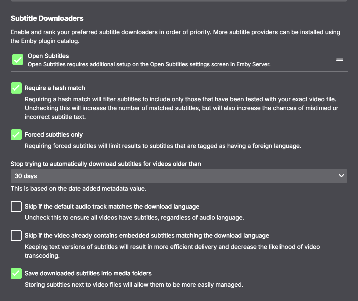 podonnell 47 Posted August 2, 2024 Author Posted August 2, 2024 45 minutes ago, Happy2Play said: Okay these per library options @podonnell Hmm, yeah I saw these during setup and was hoping that was exactly what they were for. However, it doesn't seem like it attempted to download any other subtitles, and the title in question above only has PGS subs. Would this be the job that controls the downloads? Download subtitles Last ran 9 hours ago, taking 1 second. Searches the internet for missing subtitles, if automatic subtitle downloading is enabled in Emby library setup. This has run since the title has been in my library. Thanks for the help!