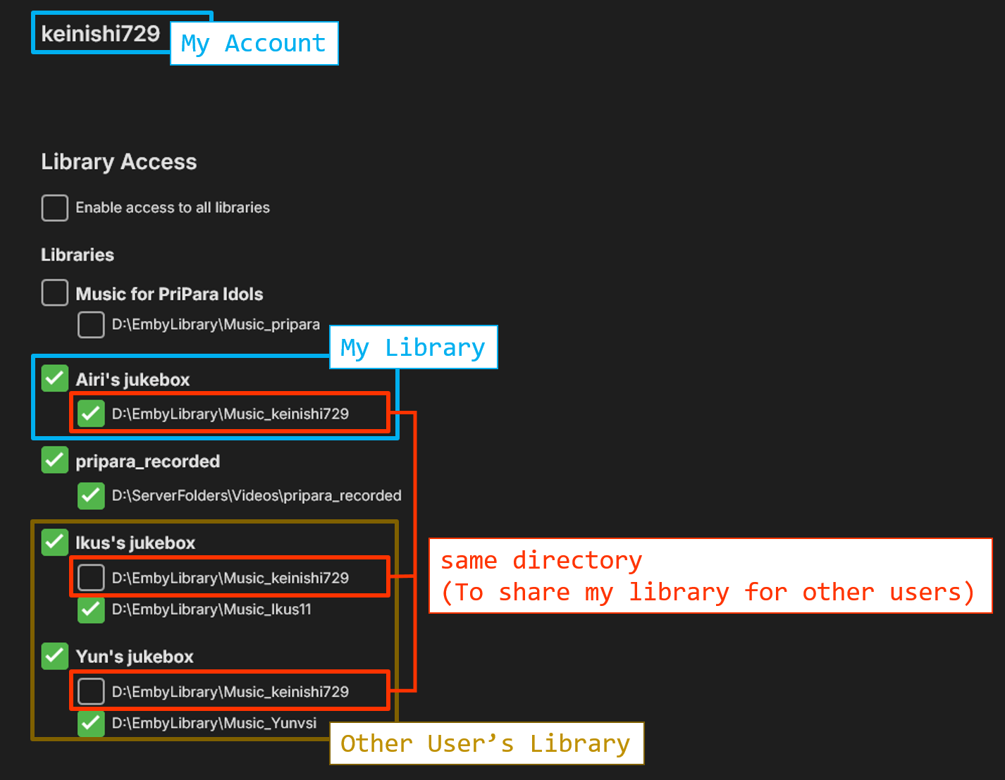 keinishi72 2 Posted August 22, 2024 Author Posted August 22, 2024 I'm sorry to delay replying. My Emby consists of a music library for multiple people. I'm able to refer my own and other users' music from their libraries. Other users can refer to their music and mine in one library. By permissions, I have it set up so that I can only see other people's music in other people's libraries. In version 4.7.x it worked fine (denied files were not visible). However, in 4.8.x, the denied files are also visible, as shown in the 3rd image.