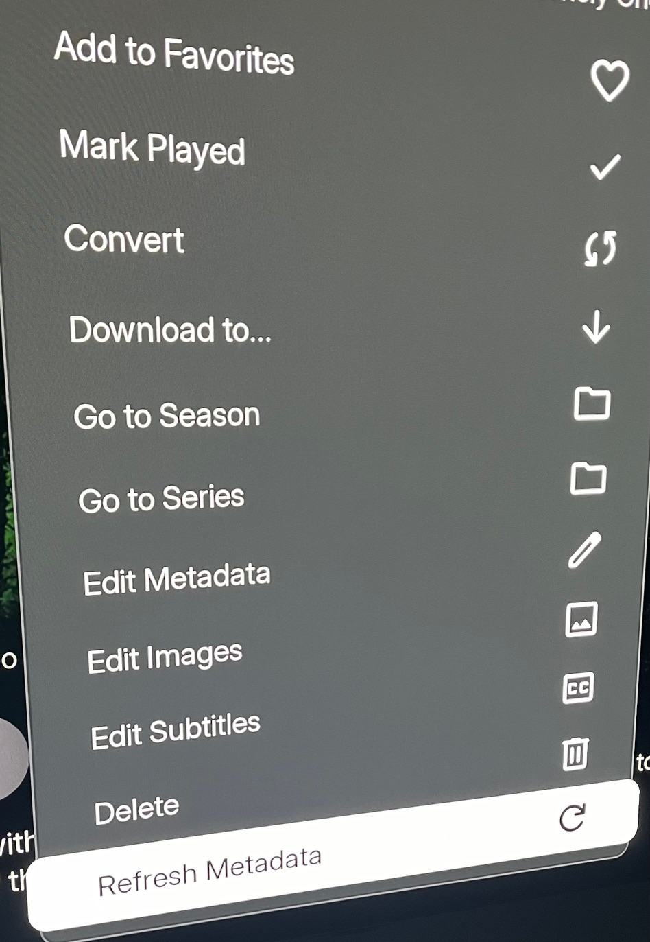 podonnell 47 Posted August 6, 2024 Author Posted August 6, 2024 5 hours ago, Luke said: It's not missing. To open this menu, press the menu or info button on your remote when the poster is selected. Umm, no such button for LG as far as I know. Any menu button I've tried opens a TV settings menu. Unless someone that has a modern LG knows another way, I've tried just about every button. The only way to get a menu up for me is to click into the title, which then loads the next screen that has a very similar menu, but is missing the option referenced above.