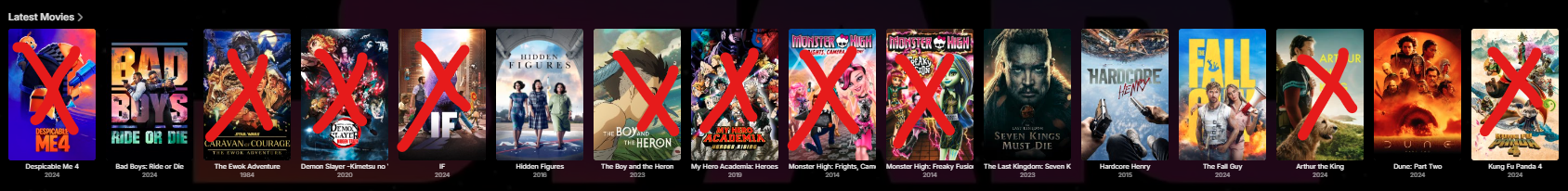 Alex3111 8 Posted August 9, 2024 Author Posted August 9, 2024 On 8/5/2024 at 11:27 PM, Happy2Play said: Minus a future added date new media should replace older media unless you watch it then of course the old will be present again. But the row is controlled by date added value. Say there are 10 movies displayed on "Latest Movies", dated from Today back to May, because not that many new stuff has been released. But during that time, truthfully about 18 NEW movies were added, and 8 were watched. The 10th movie is from May, but I have NO interest on watching ANY of them, thus the reason why they are still there. And new movies are added, that I am interested, so I keep on watching, now the SAME 10 movies are still there, showing as Latest Movies, yet again, I have NO interest on watching them, they are kid movies or simply non-interested to MY account. But there are movies from April, in fact, back from the previous November that I am interested, but totally forgot I had them because the 10 movies that I am not interested, are still taking space in the Latest Movies; same with TV Shows and Music. Some other users might be interested, that is why they requested them, and maybe THEY watched them, and are no longer showing in THEIR Latest Movies/TV Shows/Music, but you know what, I am still seeing them 10 Latest that I have no interest. So, how do I get rid of them without pressing the 'Mark Played' which screws up the algorithm for 'Suggestions'. Because I really don't care about High School Musical, nor Monster High, but they have been sitting there for months! FOr example, see the 'Latest Movies' on my system, 16 of them, see the last one, Kung Fu Panda 4, was added on I don't care to watch it, and neither do I care for Despicable Me 4, The Ewok from 1984, IF.. in fact, out of the 16, I don't care for 10 of them! But I know I have movies that I do want to watch, that are not showing there, and that I have forgotten. So when you look at the 'Latest...' it's fairly useless for MY taste. I may not have the same time to watch as my other accounts, but it plagues my 'Latest...' yet there is NO way to remove them, unless I select: Mark Played... then, there goes my suggested portion, which I find WAY more useful from actual movies that I have watched. Again, I am not a programmer, but seems that a simple "Not Interested' which simply removes it from the 'Latest ...' would simplify the issue at hand; and it is hard for me to believe that I am the only adult going through this; unless every other Emby user simply doesn't have children wanting to watch things. Or other users that may be allowed to request items that simply do not interest the owner of the system. and looking into my 'Suggestions', yes I would be interested on watching some of them since I watched...