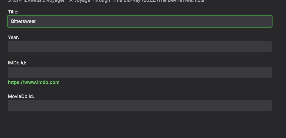 podonnell 47 Posted August 14, 2024 Author Posted August 14, 2024 (edited) 15 minutes ago, Luke said: Imvdb is all name based, so you have to enter that into Identify. That's what I've been trying. I am getting what appears to be all movies, maybe TV. No music videos return. Example below... Here's a result on imvdb: https://imvdb.com/video/fuel/bittersweet Here's my identify attempt: Â Here are the results I got back, none match the above result: Edited August 14, 2024 by podonnell