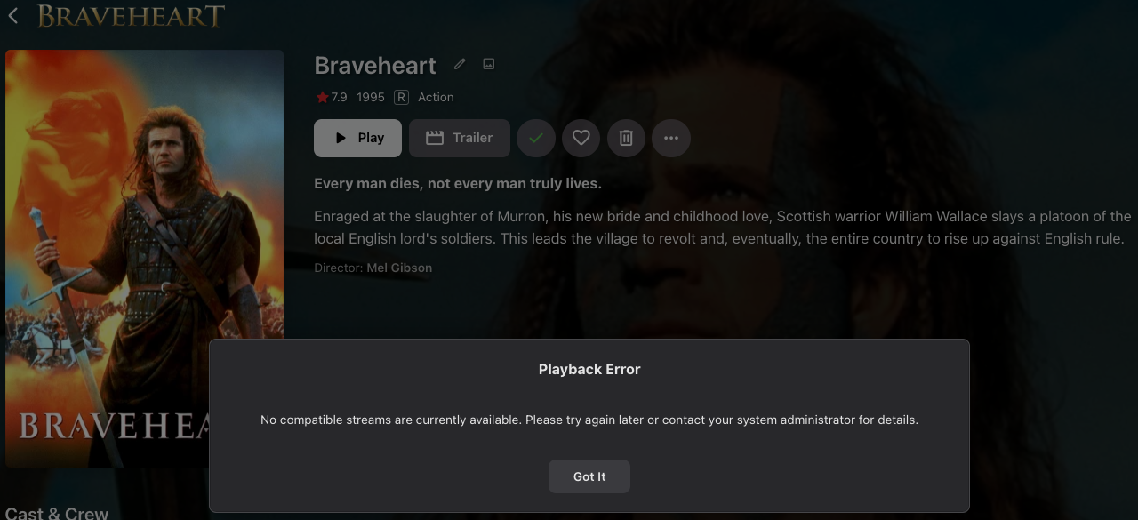 Ek_Korat 0 Posted August 12, 2024 Author Posted August 12, 2024 19 hours ago, Luke said: @Ek_Korat Hi there, let's look at an example. Please attach the information requested in how to report a media playback issue. Thanks! Hi @Luke I've setup the Emby server on my MacBook (M1) with latest version downloaded from Emby Server for macOS - Emby Then I add folder where I stored the strm file to the library. The url format from the file in Google drive is https://drive.google.com/uc?export=download&id=122gohfRp5Ip3tlrnoTr2qCmv1_a7wn_m When I play the media it error as below. And I've attached the log file for you to verify as well. Braveheart.1995.2160p.HDR.5.1.x265.10bit (1).strm ffmpeg-transcode-7fdae67a-aa6f-439c-9008-e4fbbe1d9e15_1.txt