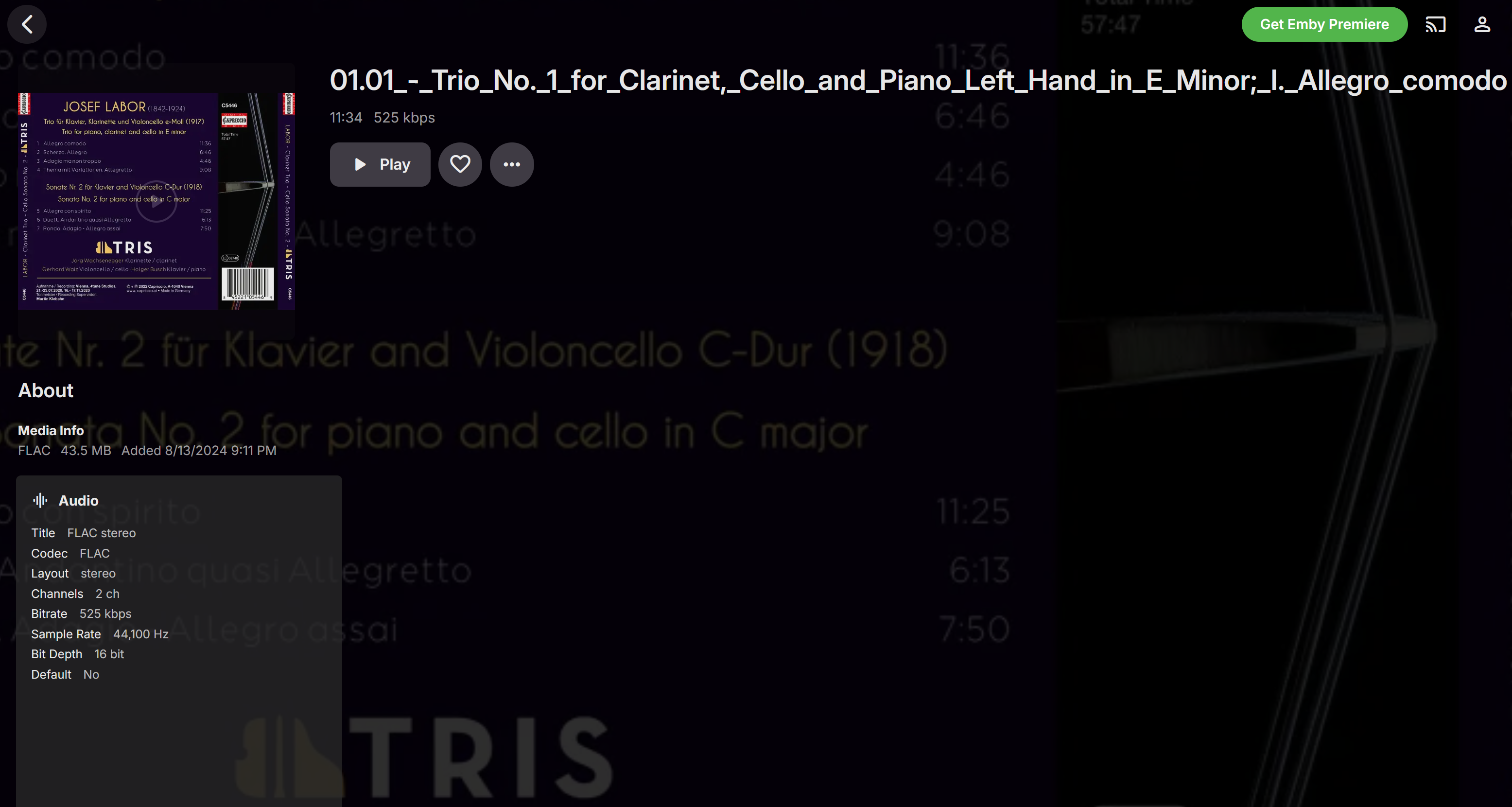 Samardzic 1 Posted August 15, 2024 Posted August 15, 2024 Emby server installed on Windows 10 pro (Dell optiplex 3070 mini pc with i3 and 16 Gb RAM... used only as a server). The problem is when come to reproduction of some files, it simply shows error message on web browser (edge or firefox), or on android phone plays music without any voice. What is strange, on android says that piece of music has duration of billion of minutes. If you play the same file through EDGE (directly as a file) or using VLC on PC computer, you can hear music properly. Same file through Emby, simply provide error or not played. Herein attached at least one file (received from NAXOS records as free sample) which makes problems. 01.01_-_Trio_No._1_for_Clarinet,_Cello_and_Piano_Left_Hand_in_E_Minor;_I._Allegro_comodo.flac