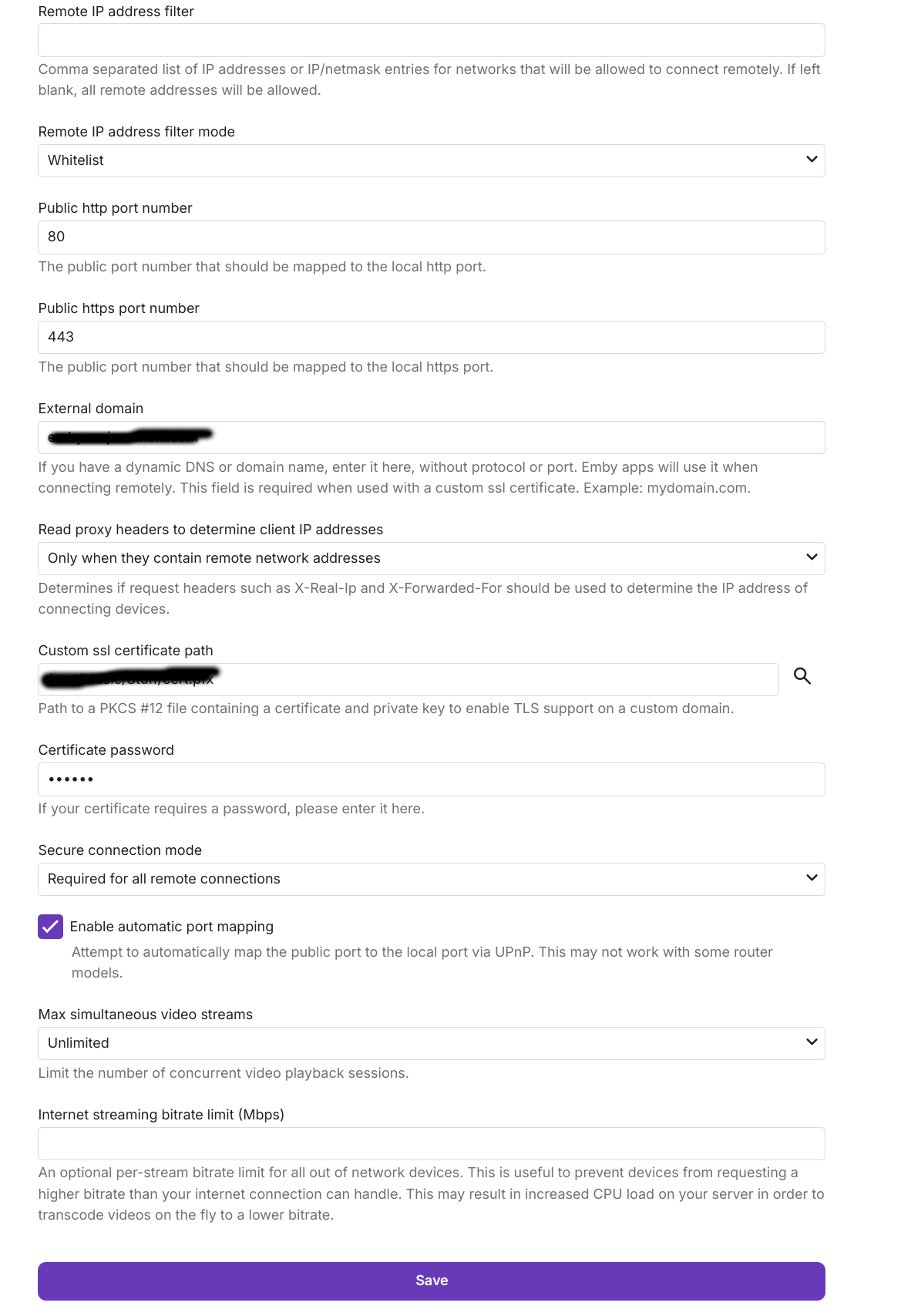 The 'public' ports are what Emby tells the clients to use to connect. If these are different than the 'local' ports, you need some infrastructure to receive that connection and route it to the local ports; such as a reverse proxy, or simply a port forwarding rule with the correct external(public) and internal(local) ports.