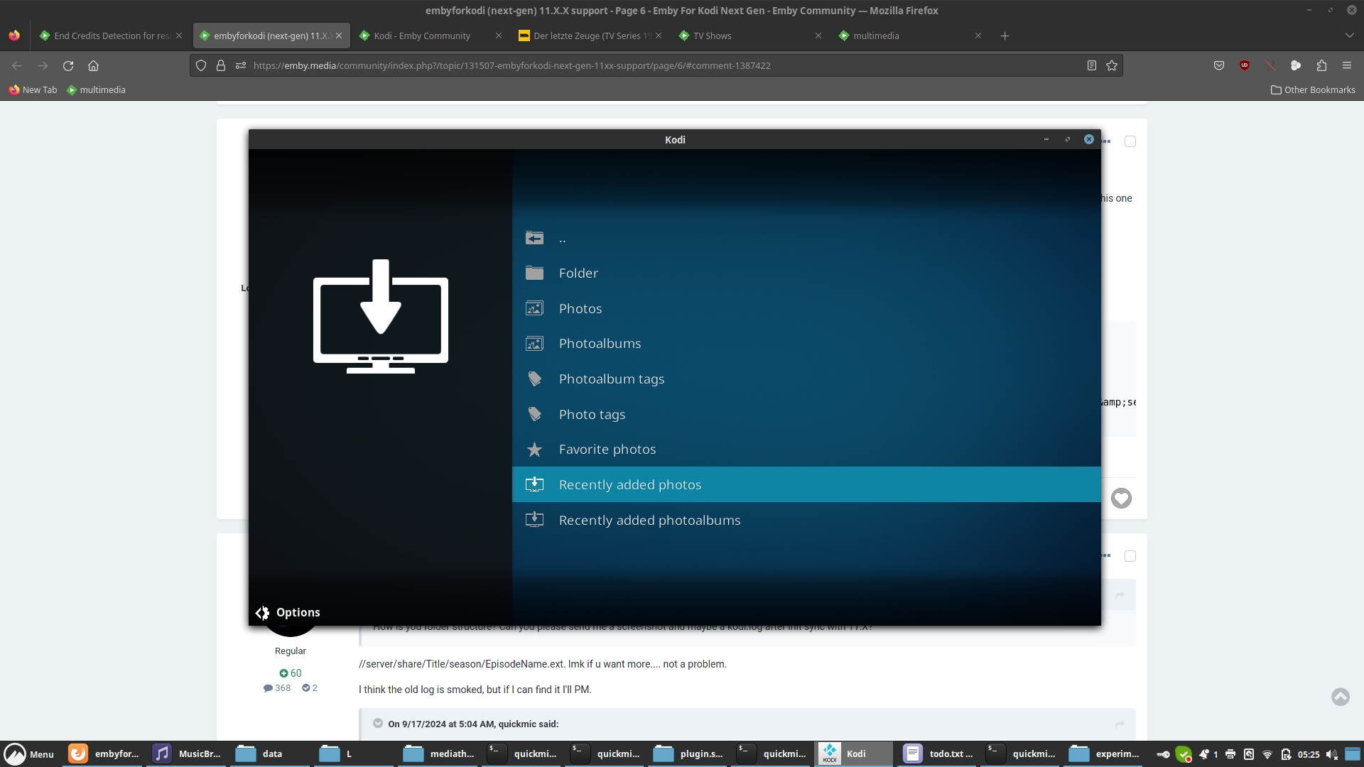 quickmic 1703 Posted September 19, 2024 Author Posted September 19, 2024 (edited) On 9/17/2024 at 8:48 PM, FrostByte said: @quickmic Could you add a recentlyadded_photo dynamic node to Home videos and photos? I see one for recent videos and photo albums, but not one for just plain photos. I use this one for spotlights, etc. It's basically your recentlyadded_video node, but changed the content type to Photo. recentlyadded_photo.xml 363 B · 1 download <?xml version="1.0" encoding="UTF-8" standalone="yes" ?> <node order="69" type="folder"> <label>Recently added photos</label> <icon>picture.png</icon> <path>plugin://plugin.service.emby-next-gen/?mode=browse&id=19&parentid=19&libraryid=19&content=Photo&server=59e56b566f5f49b0a60ed020c43a7153&query=Recentlyadded</path> </node> I'll doublecheck, but I have this node available under picture addons "Emby for Kodi Next gen (Picture)" supported by the image helper addon: It's a dynamic node as Kodi does not support picture sync. I assume you tried to access the nodes via video addon and it's not available there. Edited September 19, 2024 by quickmic