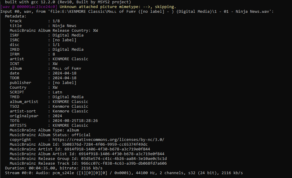 JBloom91 31 Posted August 25, 2024 Author Posted August 25, 2024 1 hour ago, Happy2Play said: Can you provide exactly what you used. As the command does work as this is the command Emby uses to see the metadata. C:\Users\Media>C:\Users\Media\AppData\Roaming\Emby-Server\system\ffprobe.exe -i file:"E:\Media\Music - emby metadata\Undersaken\Swords of Fate (cassette)\2. Cloaked Visage.flac" ffprobe version 5.1-emby_2023_06_25 Copyright (c) 2007-2022 the FFmpeg developers and softworkz for Emby LLC built with gcc 12.2.0 (Rev10, Built by MSYS2 project) Input #0, flac, from 'file:E:\Media\Music - emby metadata\Undersaken\Swords of Fate (cassette)\2. Cloaked Visage.flac': Metadata: MUSICBRAINZ_RELEASEGROUPID: 7c99f622-7289-4048-b5d1-b94a67c4c2c2 ORIGINALDATE : 2023-12-01 ORIGINALYEAR : 2023 RELEASETYPE : album MUSICBRAINZ_ALBUMID: 21dce8f8-9bbf-43f5-a0cd-53a9ad6482c0 DATE : 2024-07-08 LABEL : Vault of Discoveries CATALOGNUMBER : VOD-006 MUSICBRAINZ_ALBUMARTISTID: 0d9e4d2a-0f6c-48fc-b772-6de8b7e15e45 album_artist : undersaken ALBUMARTISTSORT : undersaken SCRIPT : Latn RELEASESTATUS : official ALBUM : Swords of Fate TOTALDISCS : 1 MEDIA : Cassette disc : 1 TOTALTRACKS : 10 MUSICBRAINZ_TRACKID: da49fb23-62d7-4356-9130-542cd194692a TITLE : Cloaked Visage MUSICBRAINZ_ARTISTID: 0d9e4d2a-0f6c-48fc-b772-6de8b7e15e45 ARTIST : undersaken ARTISTSORT : undersaken ARTISTS : undersaken MUSICBRAINZ_RELEASETRACKID: 291daf85-f738-4d89-b14e-d10c00ef13df track : 2 GENRE : Barber Beats;Downtempo;Electronic;Experimental;Vaporwave TRACKTOTAL : 10 DISCTOTAL : 1 Duration: 00:04:47.78, start: 0.000000, bitrate: 1582 kb/s Stream #0:0: Audio: flac, 44100 Hz, stereo, s32 (24 bit) Stream #0:1: Video: png, rgba(pc), 2000x2000, 90k tbr, 90k tbn (attached pic) Metadata: comment : Cover (front) I went into the folder and found the ffprobe.exe. Double clicked on it multiple times, ran as administrator, nothing happened. If I am supposed to enter a command I am unsure where I'm supposed to do so.