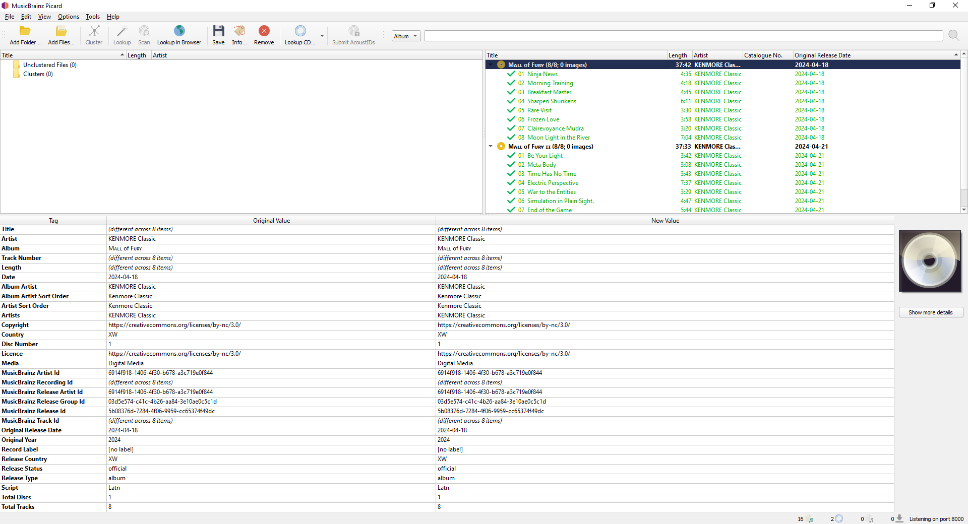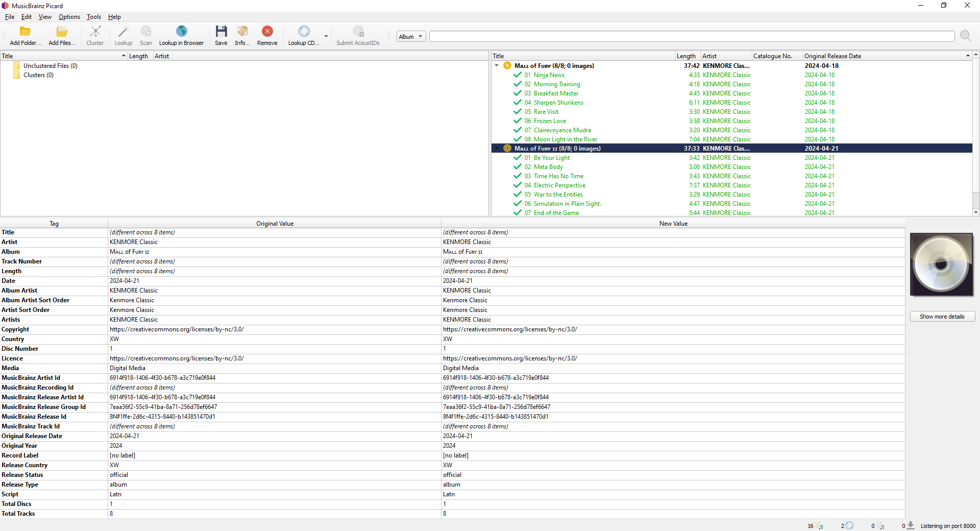 user24 313 Posted August 25, 2024 Posted August 25, 2024 As these two MALL of FURY albums are freely downloadable from Bandcamp, I downloaded the FLAC versions to see if I could help: The direct downloaded files imported correctly into Emby with the basic info shown correctly. Running through Picard - no problems importing Running through Mp3tag - no problems importing Looking at your screenshot with the errors, I did wonder if you had two Album titles separated by a semi-colon e,g. "English Title; Japanese Title". If this was the case, then perhaps Emby is not recognising the Japanese characters, but also Emby does not allow for multiple Album titles (AFAIK) so the semicolon character appears in the Album title (I could replicate this). Maybe this gives you some clues? If not perhaps someone else can download the Albums and try to figure it out? 1