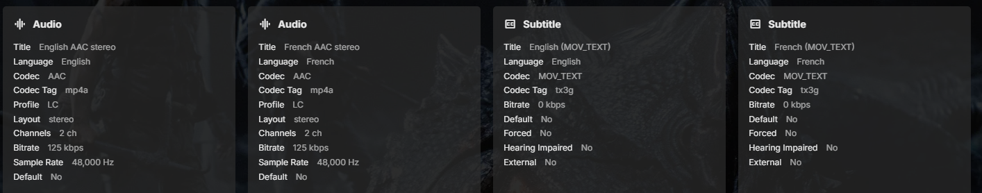 dprovencher 1 Posted August 30, 2024 Author Posted August 30, 2024 Here is one video as an example : What mediainfo shows : Audio #1 ID : 3 Format : AAC LC Format/Info : Advanced Audio Codec Low Complexity Codec ID : mp4a-40-2 Duration : 1 h 41 min Bit rate mode : Constant Bit rate : 125 kb/s Channel(s) : 2 channels Channel layout : L R Sampling rate : 48.0 kHz Frame rate : 46.875 FPS (1024 SPF) Compression mode : Lossy Stream size : 91.4 MiB (2%) Title : BAMTech audio / English Language : English Default : No Alternate group : 2 Tagged date : 2024-08-30 14:06:18 UTC Audio #2 ID : 4 Format : AAC LC Format/Info : Advanced Audio Codec Low Complexity Codec ID : mp4a-40-2 Duration : 1 h 41 min Bit rate mode : Constant Bit rate : 125 kb/s Channel(s) : 2 channels Channel layout : L R Sampling rate : 48.0 kHz Frame rate : 46.875 FPS (1024 SPF) Compression mode : Lossy Stream size : 91.4 MiB (2%) Title : BAMTech audio / Français (Canadien) Language : French (CA) Default : No Alternate group : 3 Tagged date : 2024-08-30 14:06:18 UTC Text #1 ID : 5 Format : Timed Text Muxing mode : sbtl Codec ID : tx3g Duration : 1 h 41 min Bit rate mode : Variable Bit rate : 56 b/s Frame rate : 0.487 FPS Stream size : 41.2 KiB (0%) Title : English [CC] Language : English Default : No Forced : No Alternate group : 4 Tagged date : 2024-08-30 14:06:18 UTC Count of events : 1478 Text #2 ID : 6 Format : Timed Text Muxing mode : sbtl Codec ID : tx3g Duration : 27 min 24 s Bit rate mode : Variable Bit rate : 1 b/s Frame rate : 0.010 FPS Stream size : 253 Bytes (0%) Title : fr-CA--forced-- Language : French (CA) Default : No Forced : Yes Alternate group : 5 Tagged date : 2024-08-30 14:06:18 UTC Count of events : 8