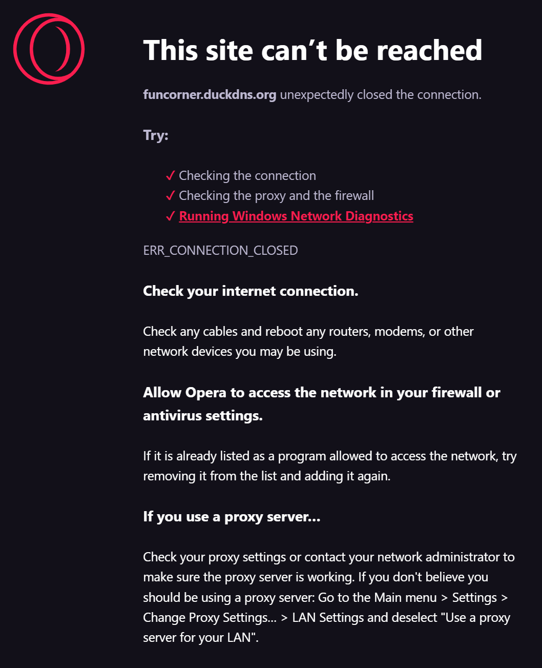 Alexmh 2 Posted August 31, 2024 Author Posted August 31, 2024 6 minutes ago, Q-Droid said: Going back to your router port forwarding, you don't have your external port number defined. There are so many router interfaces and not all of them clearly describe their options. I think external port number is the WAN interface port. The internal port number is the LAN destination port. External source port number should be any. I don't know if for your device that means 0 or empty (no value). Your map for this port forwarding should be like this: Client [any IP:any port] <--> WAN IP:7920 <--> LAN IP:7920 Client [any IP:any port] <--> WAN IP:7921 <--> LAN IP:7921 Edit: Client in this case would be "source" I have the external port number defined right now. That was just my initial setup because if I did define a port, the port checker would say that my port is closed. If I didn't define it it would say opened. However, now it's open in both situations. Although, when I didn't have my extern port defined I could access the server from the local network both from my IP and DDNS, but not from the external network. I still can't access it externally even though I have it defined, and ofc, I can't access it even locally from my WAN IP or DDNS. Also, both 0 and empty, counts as (no value).