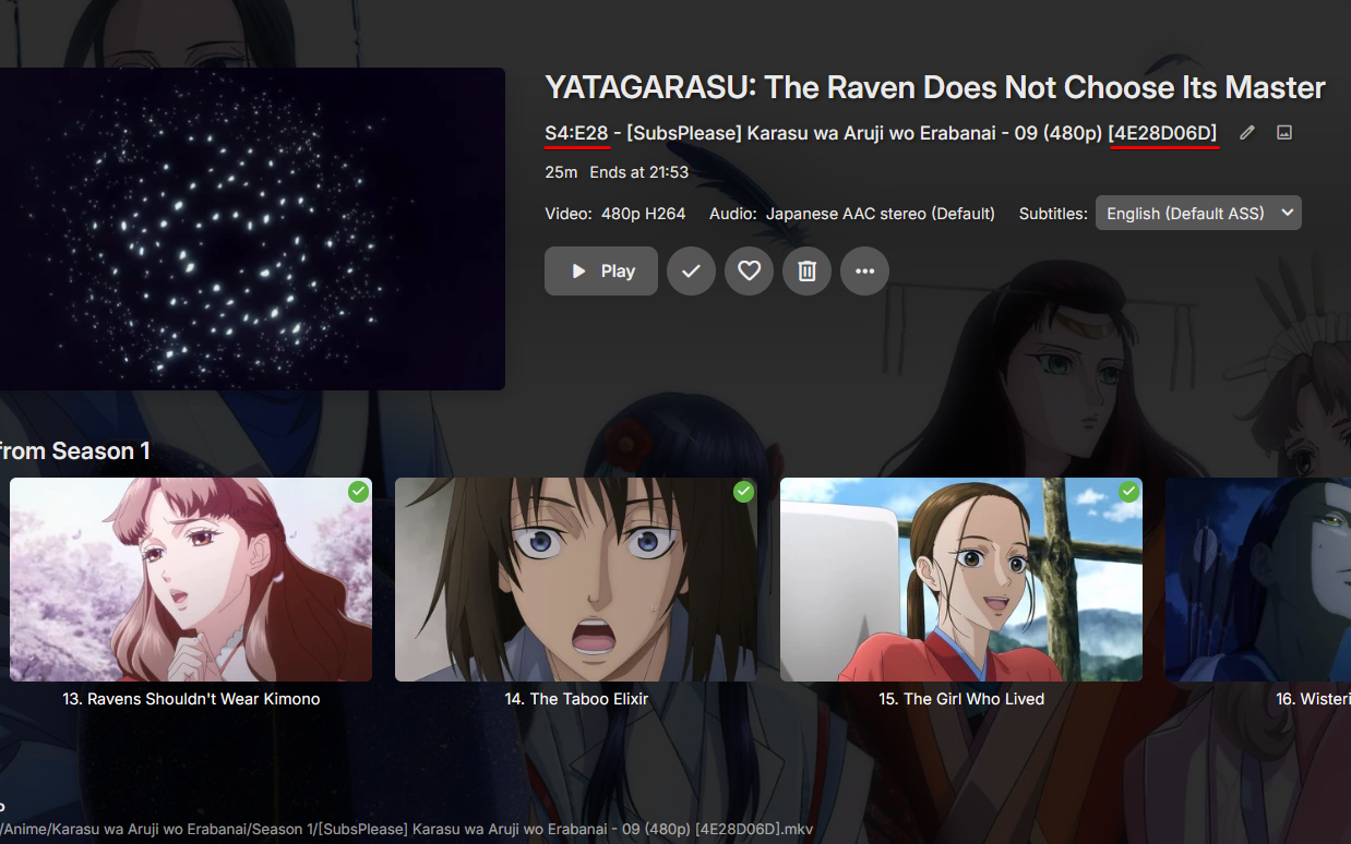 Loke 4 Posted August 31, 2024 Posted August 31, 2024 (edited) Version 4.8.8.0 Anime is a PITA due to the various naming conventions. One issue I have recently seen is that emby can get confused by the CRC32 in the filename and parse it as S[x]E[y]. As you can see on the lower left corner the file is stored with a path matching <Series>/<Season X> I assume that renaming the file to [SubsPlease] Karasu wa Aruji wo Erabanai - S01E09 (480p) [4E28D06D].mkv might solve the issue but I can't do that. Is there something else I could do (excluding manually modifying the metadata per episode)? Would it be possible to ignore the CRC32 field when trying to figure out the episode seeing as it is always 8 alphanumeric characters? In addition how does the episode naming compare to the season directory naming? Is the naming of the dir, in this case season 1, ignored due to the filename? I would expect that the directory name would take priority. Thanks Edited August 31, 2024 by Loke
