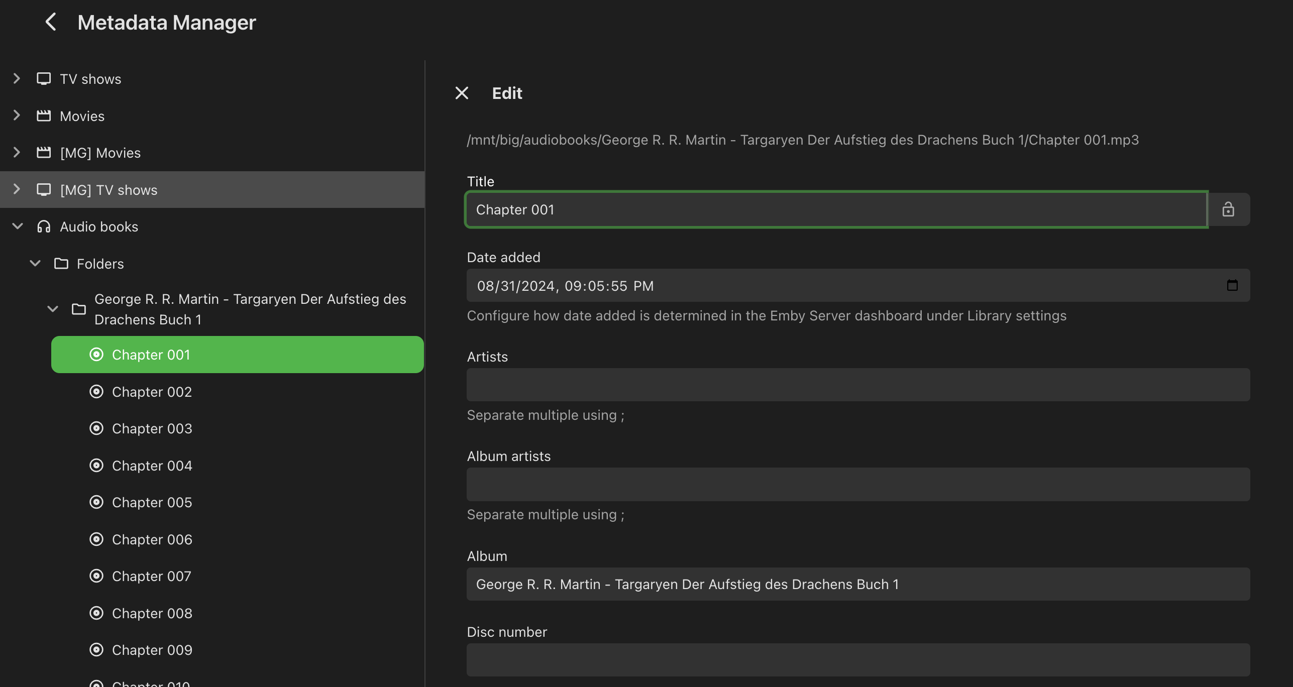 After updating this field and rescanning metadata, the audio book finally appears as an album/book.