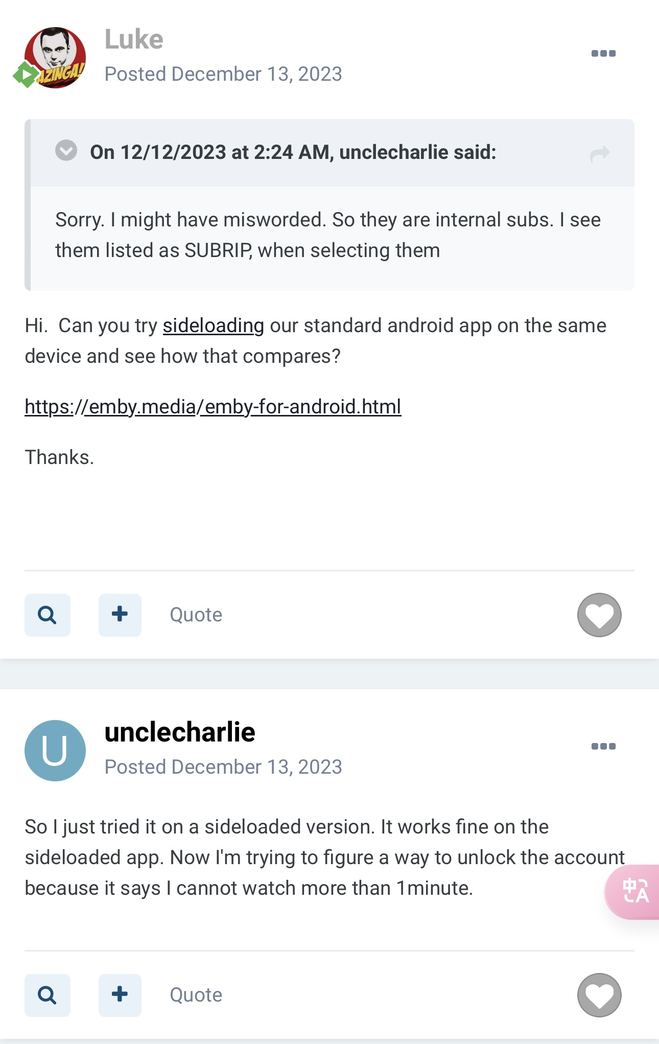 excelsior 0 Posted September 1, 2024 Author Posted September 1, 2024 i tride sideloading standard android app on the same device and str sub works well。 but,standard android app playback its locked,theres noway to unlock,even i want to pay for it。 pls fix “str sub‘ issue ”on emby for android tv,or add unlock playback in one -time purchase on standard android app。