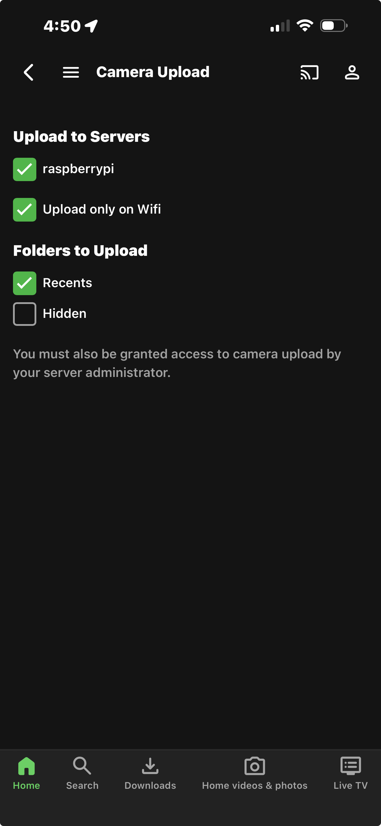 al92780 7 Posted September 5, 2024 Author Posted September 5, 2024 Camera Upload: path: /home/media/EMBY/Cameras/ Create Subfolder… CHECKED servers; raspberrypi, upload only wifi CHECKED FOLDERS: Recents checked