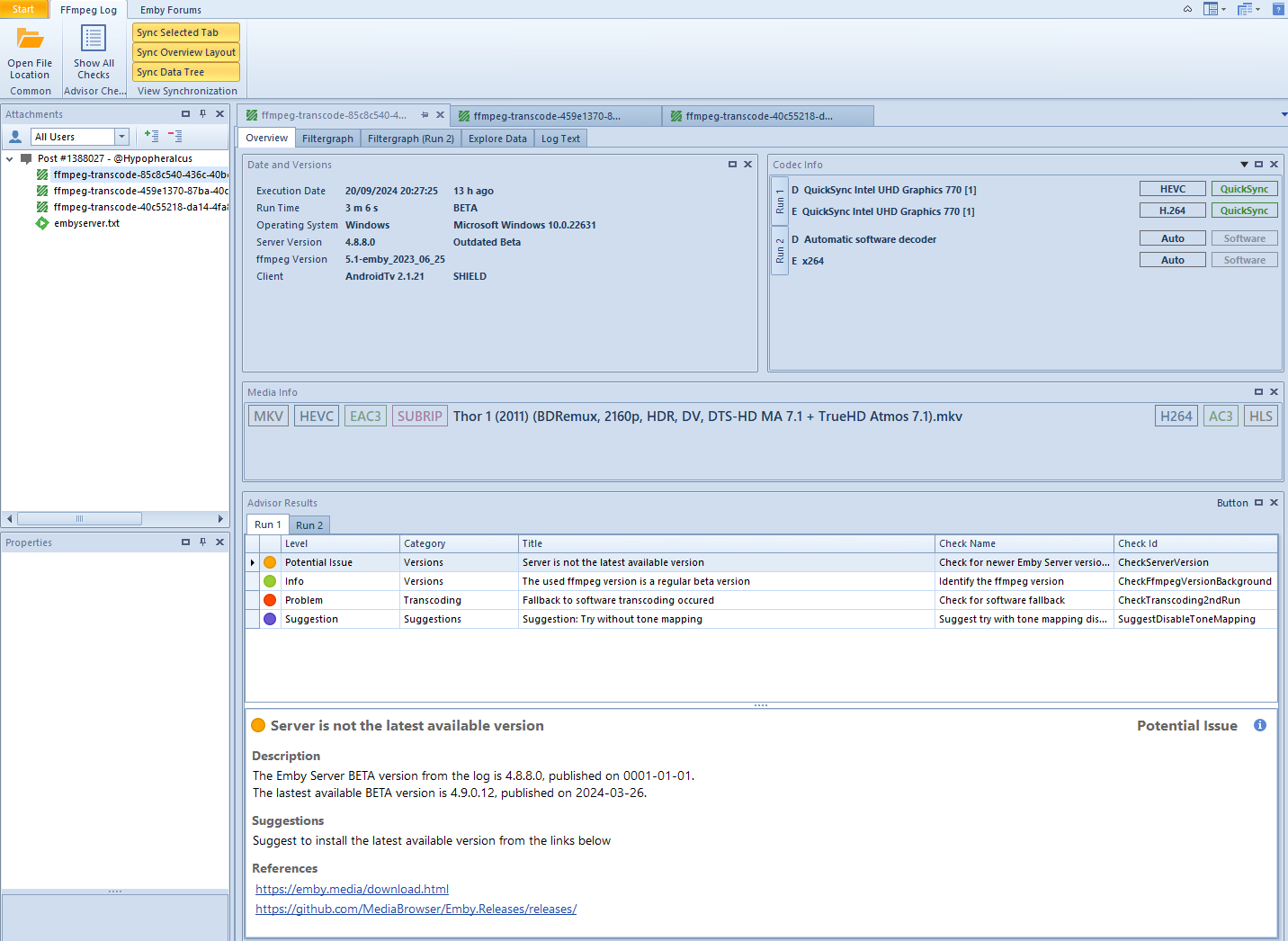 yocker 1248 Posted September 21, 2024 Posted September 21, 2024 34 minutes ago, rbjtech said: I didn't look at the logs - sorry it was a late reply from me. The Emby support tooling is suggesting ffmpeg problems and/or tonemapping problems - 1. Ensure you are using the latest beta incl the ffmpeg. 2. Use the latest drivers from Intel for the UHD 770 3. Ensure you have transcoding set to throttle. (and it's a fast ssd/nvme - which I assume it is) 4. If that still fails - then they will likely need a small sample of the file to test. I don't personally have any issues transcoding/tonemapping 4K remux's remotely - never tried to a Shield, but that should not make any difference - you will at that point - only be sending SDR (tonemapped from HDR/DV) and AC3 Audio (converted from HD Audio) - unless it's direct playing. Really makes me think the intel "tone mapping" bug has found it's way to the iGPU drivers as well.