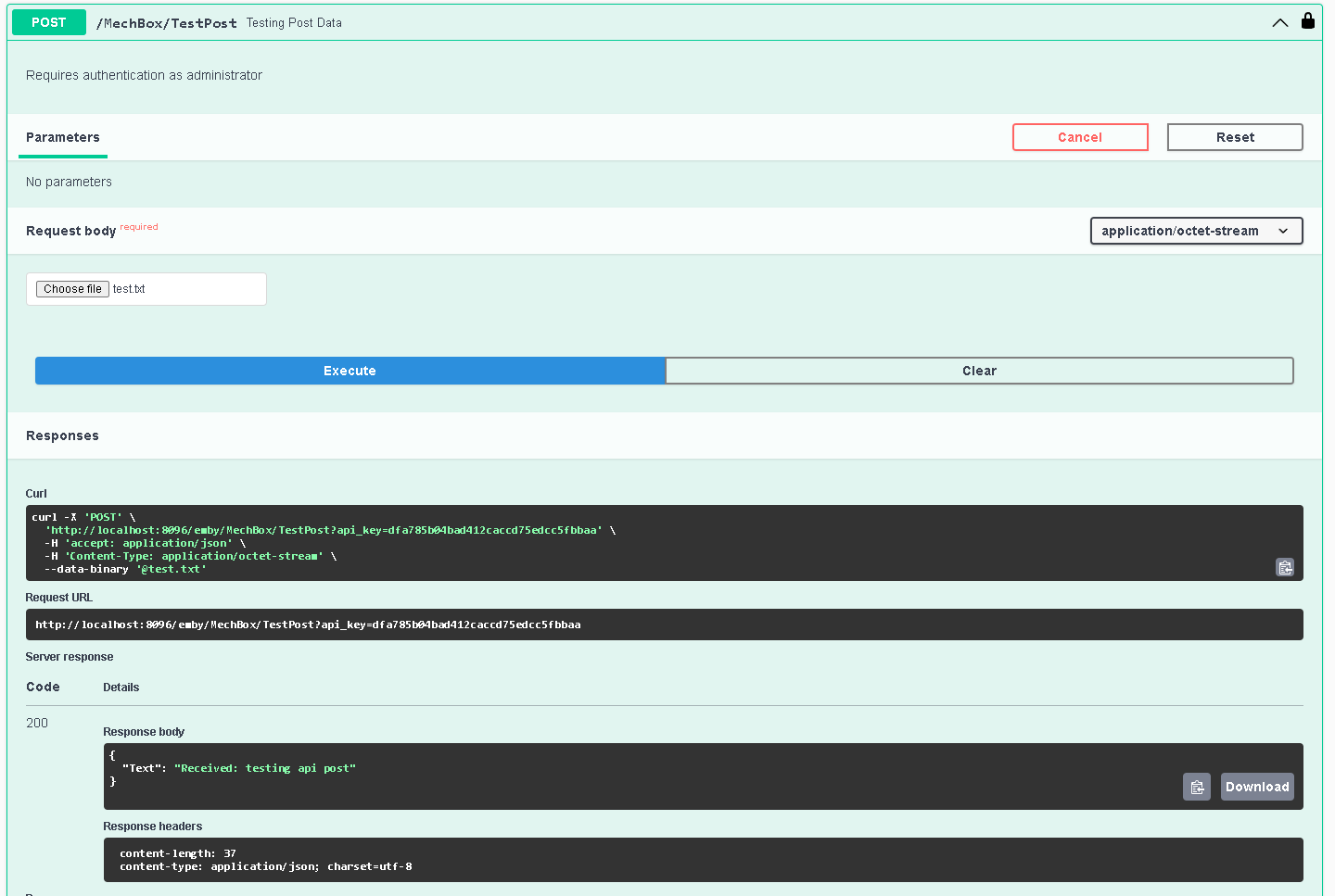 mickle026 650 Posted September 30, 2024 Posted September 30, 2024 This works, I used Swagger to send a stream (text file), in the text file was the text "testing api post", see success screenshot. [Route("/MechBox/TestPost", "POST", Summary = "Testing Post Data")] [Authenticated(Roles = "Admin")] public class Test : IReturn<object>, IRequiresRequestStream { public Stream RequestStream { get; set; } public string Text { get; set; } } public async Task<string> Post(Test request) { StreamReader reader = new StreamReader(request.RequestStream); string ReceivedJsonText = await reader.ReadToEndAsync().ConfigureAwait(true); return JsonSerializer.SerializeToString(new ReportNameErrors() { Text = "Received: " +ReceivedJsonText }); }