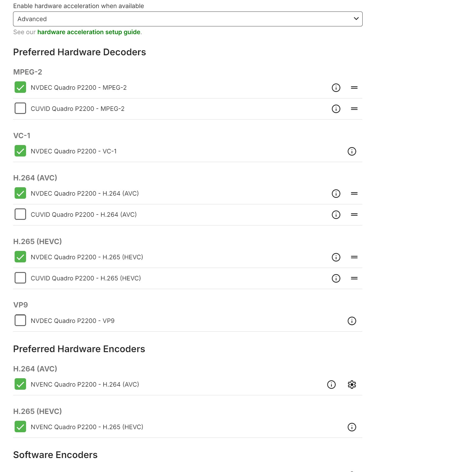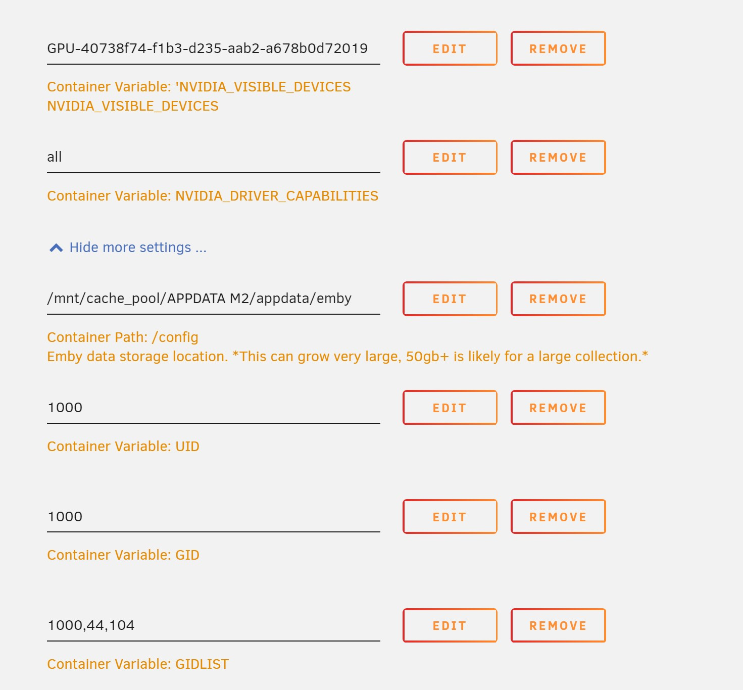 I had my Nividia GPU p22000 working fine with Plex, using the Linuxserver docker. So,  I decided when I came back to Emby I would use the same docker brand. For the life of me I can't get  it to see my card, but the system shows the card is there(See attachment)., but Emby won't pick it up. I put all the required settings in from the guide that's out there. and rebooted.  I did go to Advanced settings, doesn't show card. The only thing I haven't tried is removing the drivers and putting them back in. They were working for Plex so I didn't see any need to. I'm using the Nvidia Driver plugin from Unraid. Tried downgrading the drivers one version. (I'm up to date)
