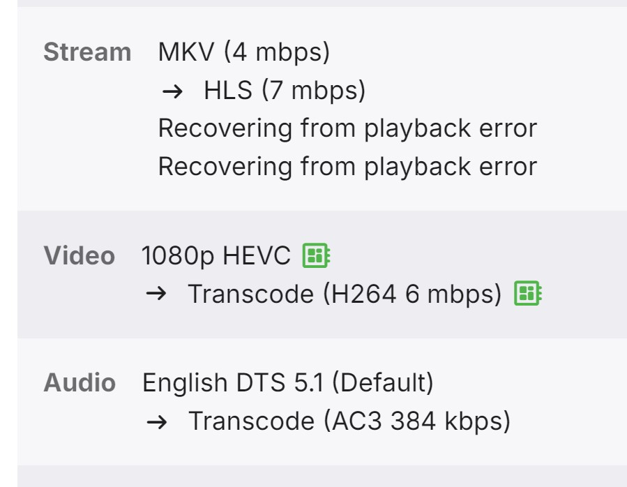 This is strange, the movie is showing transcode, but the gpu is showing it is not in use. The movie shouldn't even be transcoding, it's a newer Fire stick they are using.  My gpu always shows Processes: 1 no matter what. Something is still off a bit.  FYI: I have a 3 gig  Fiber line.