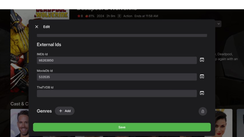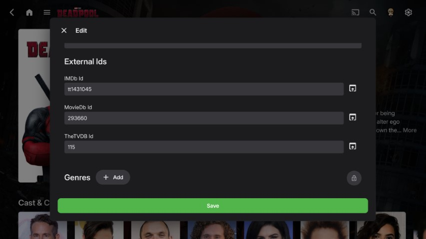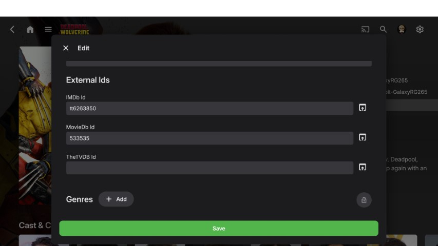 mickle026 650 Posted October 6, 2024 Posted October 6, 2024 (edited) 1 hour ago, jelum said: In the log, I found 20 different providers: Imdb, Tvdb, Tmdb, official website, facebook, etc.. (Honestly, I didn't think they would be so much). Can you please check if your Deadpools have the same providers with the same values? @jelumJust for your info, you can extend provider ids in emby to be as many as are coded. Here is my plugin that does just that. I'll supply links incase you are interested. https://emby.media/community/index.php?/topic/120013-custom-external-links-provider-ids/ latest dll here: https://emby.media/community/index.php?/topic/120013-custom-external-links-provider-ids/&do=findComment&comment=1300870 Edited October 6, 2024 by mickle026 1 2