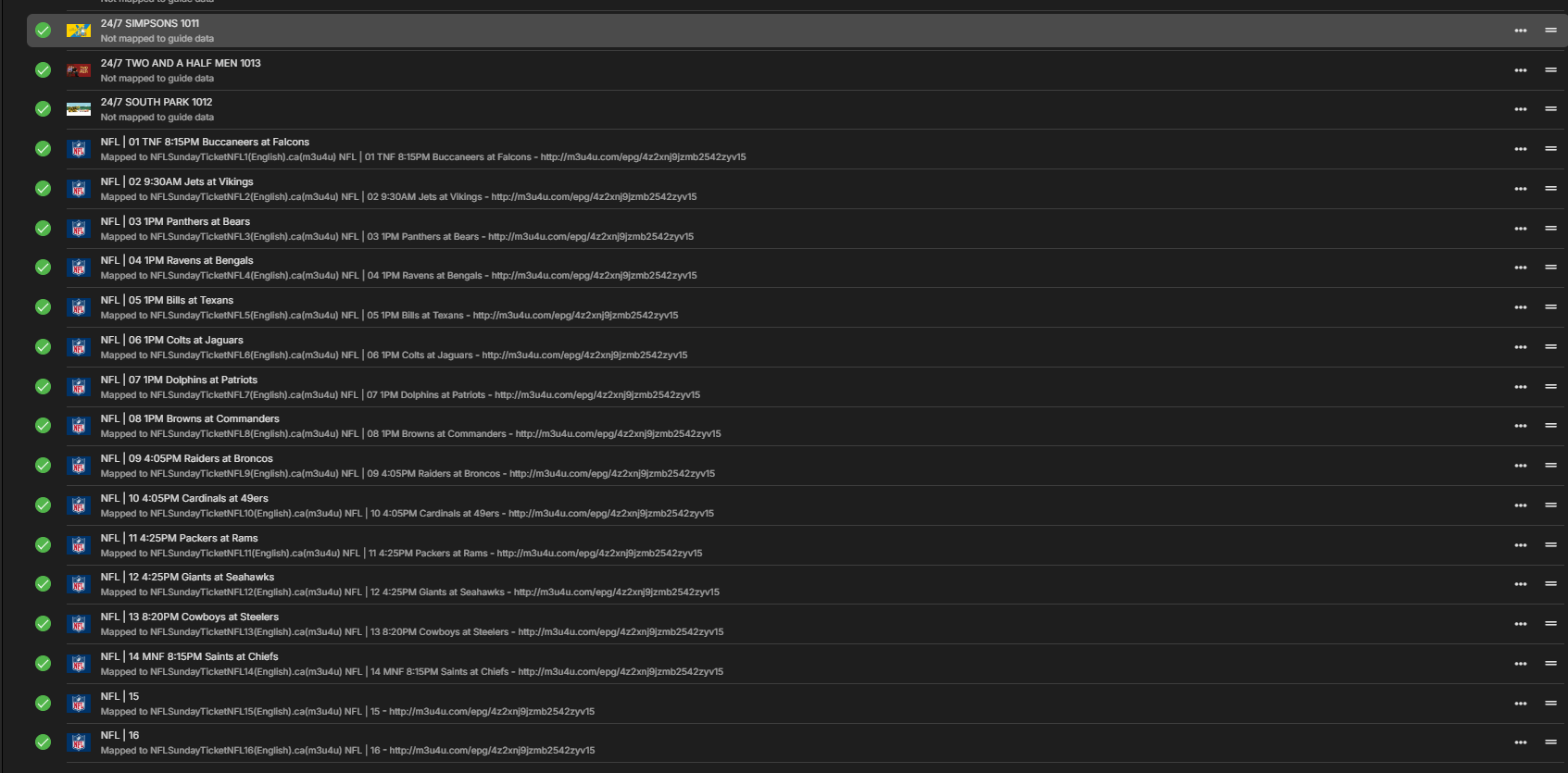 CharlesF 36 Posted October 3, 2024 Author Posted October 3, 2024 Well actually every channel other than nfl and the 24/7 have tvg-ids, so why would channels without be randomly placed in a list of channels with? I just figured those without would be placed at the beginning or end. the only solution is to manually create an m3u and then not have the info on the games.