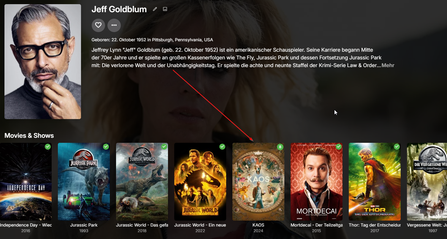 Happy2Play 9781 Posted October 22, 2024 Posted October 22, 2024 40 minutes ago, RRo100 said: Emby Version 4.9.0.14 beta, Clients: Web, Amazone TV Stick und LG TV How can I check if the database is OK Okay you are on an older beta install during the time of the change to merge Movie & Show rows that everyone disliked and was reverted back to two row and could have another anomalies per the beta channel. But dev may have to comment and see server log but odd are you don't have the log when anomaly happened. As you do have the images above for Kaos that shows both Actors and not showing the link on the one persons page. Is there a reason you are still on a old version? As there have been like 15 beta release since then.